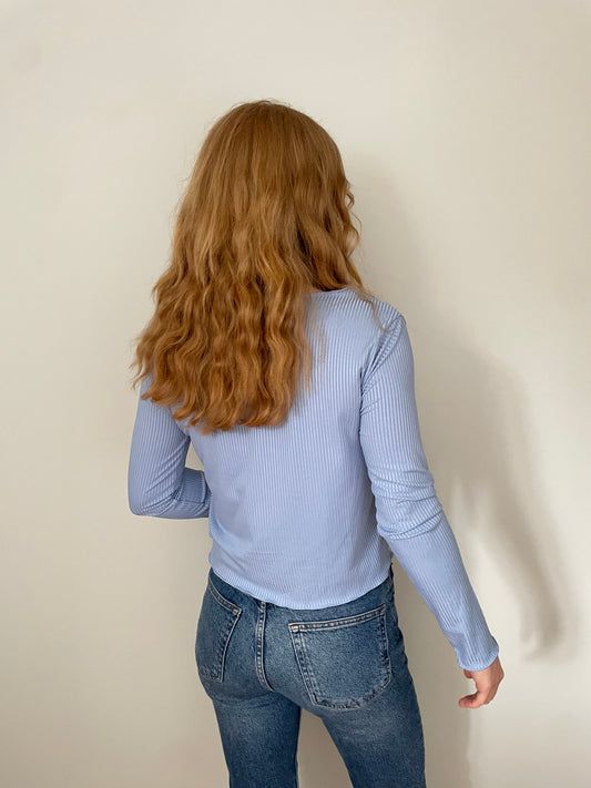 Soft Blue Ribbed Button Front Long Sleeve Top – Size XS–S