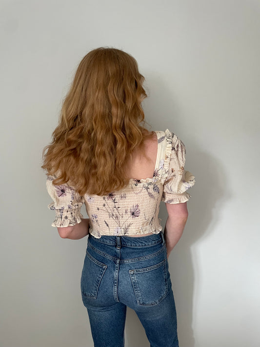 H&M Cream Floral Smocked Puff Sleeve Crop Top – Size XS