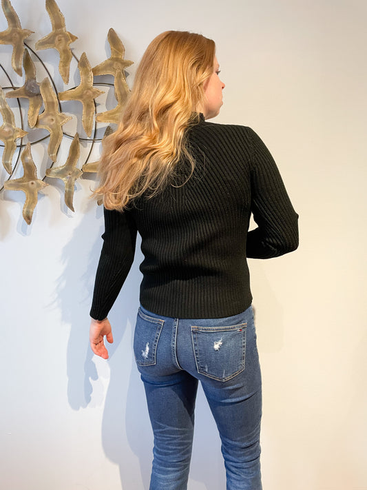 Black Mock Neck Ribbed Stretch Knit Sweater - M/L