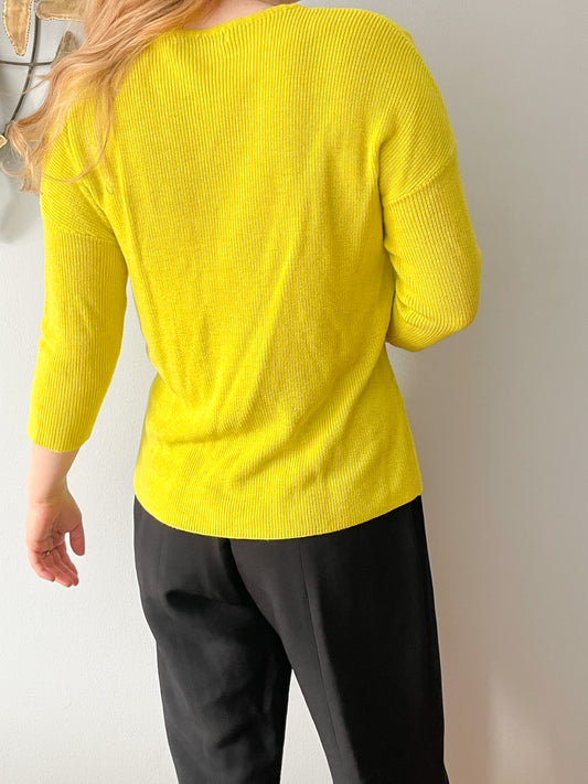 Mango Chartrues Yellow Knit V-Neck 3/4 Sleeve Sweater - M/L