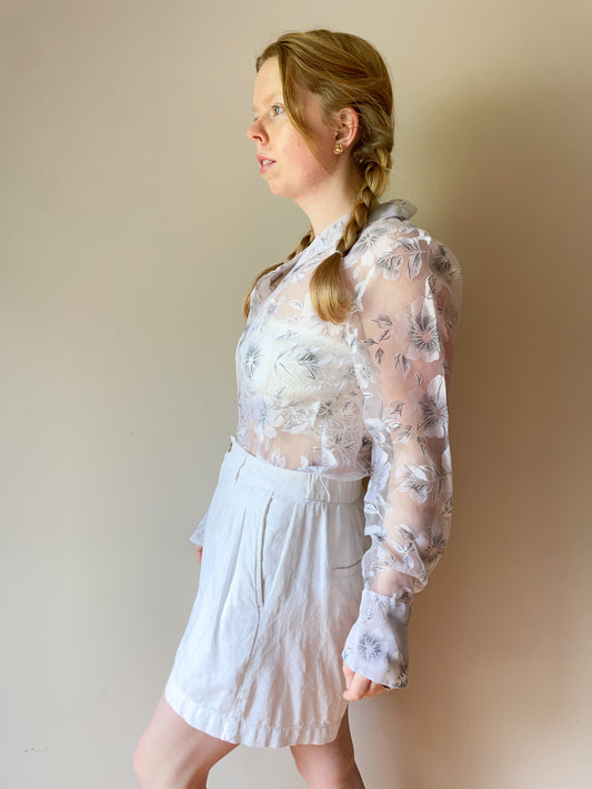 White Sheer Hibiscus Floral Print Button Down Shirt - Medium
