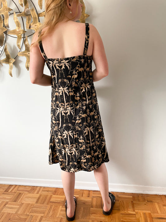Cream Black Tropical Palm Print V-Neck Dress - Small