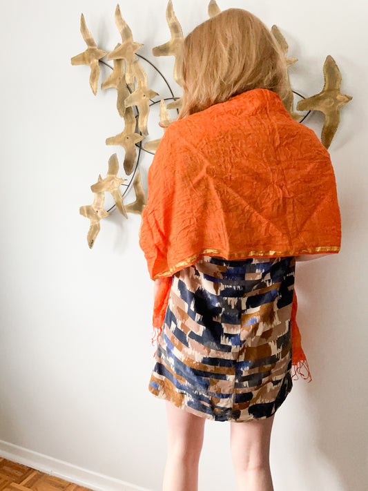 Cassis Orange Gold Metallic Linen Cotton Blend Fringe Scarf Shawl Sarong