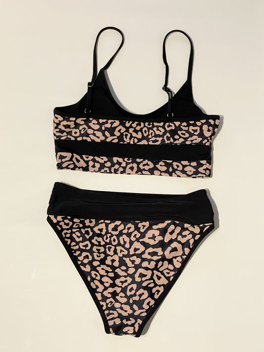 Black Taupe Leopard Print High Rise Two Piece Bikini Set - Medium