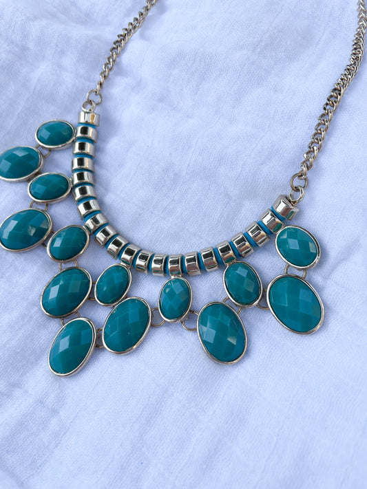 Teal Statement Bib Necklace – Gold-Tone Chain & Faceted Gemstones