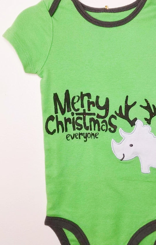 Green Rhino Reindeer Sparkly Merry Christmas Upcycled Bodysuit by Eco Pretty - 6-12 Months