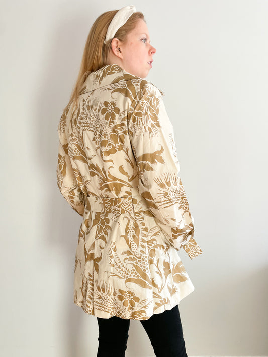 CAbi Gold Metallic and Cream Brocade Floral Cotton Linen Ladies Trench Coat NWT - Large