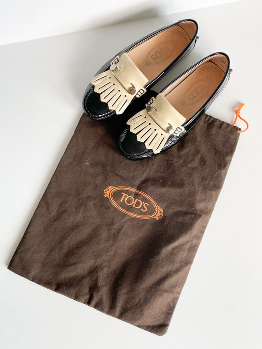 TOD'S Black Cream Fringed Patent Leather Loafers - Size 34
