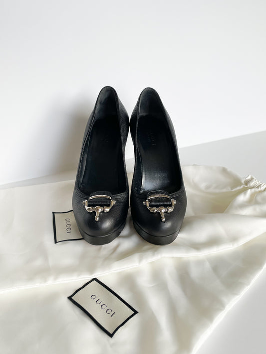 GUCCI Black Genuine Leather Silver Horsebit 3.75" Heels - Size 35