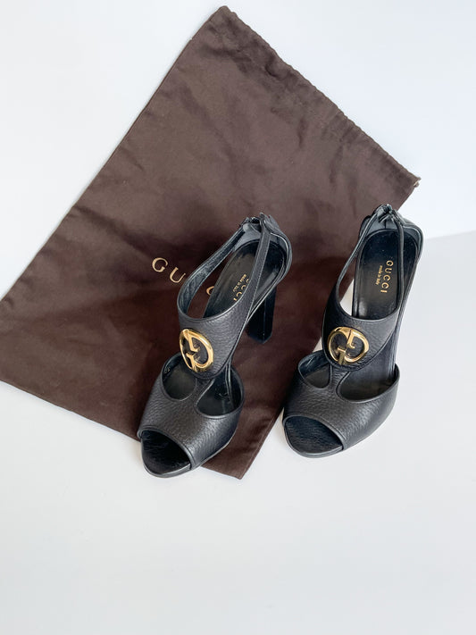 GUCCI Black Genuine Leather Logo Peeptoe 4" Heels - Size 35