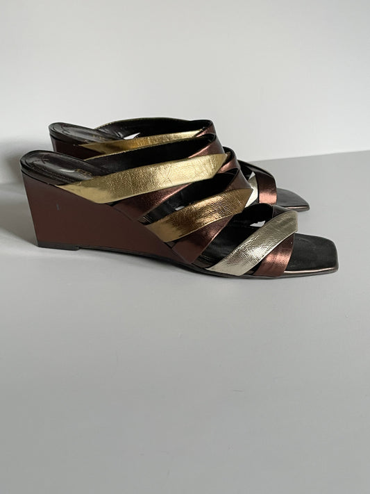 Franco Sarto Leather Bronze Silver Gold Strap Square Toe Wedge Heel Sandals - Size 6.5