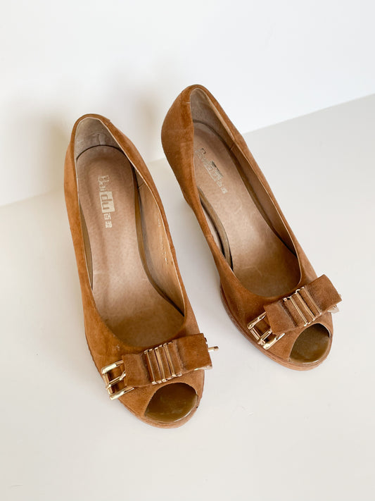 Baidu Tan Suede Leather Bow Peep Toe Heels - Size 6