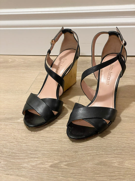 Enzo Angiolini Black Leather Strappy Sandals with Gold Wedge – Size 7.5