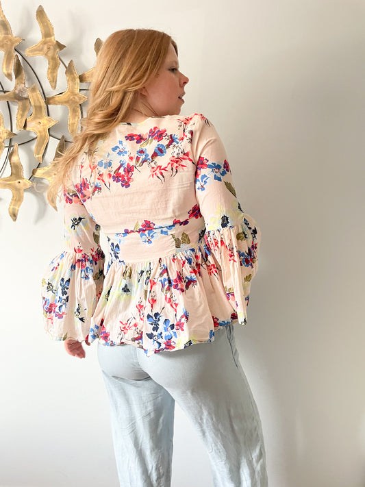 Jane & Delancey Blush Floral 100% Cotton Bell Sleeve Babydoll Peplum Ruffle Top - S/M