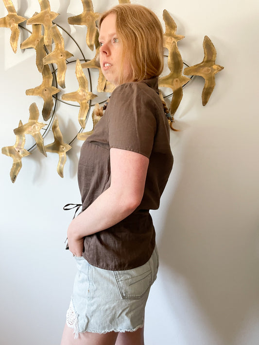Sisley Brown Ramie Blouse Top with Waist Tie - Small