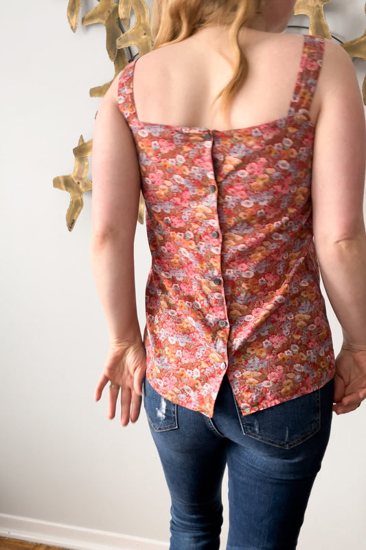 Vintage Rouie Red Floral Cotton Button Back Square Neck Top - Small