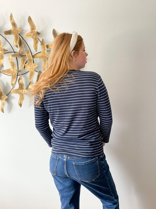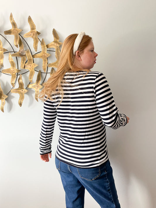 Jones New York Navy White Stripe Cotton Stretch Long Sleeve Top - XL