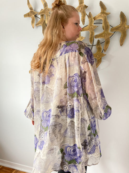 Chére Marie Vintage 100% Silk Purple Floral Balloon Sleeve Duster Shawl - XL/XXL