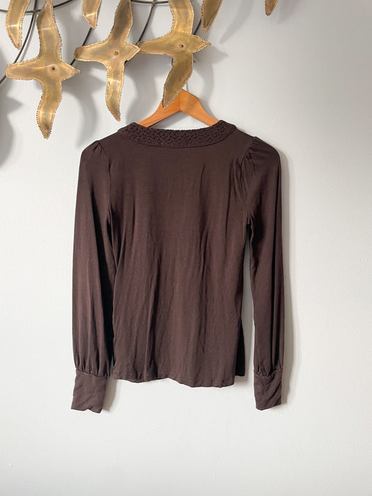 In Wear Brown Crochet V-Neck Empire Waist Balloon Sleeve Jersey Top - XS/S