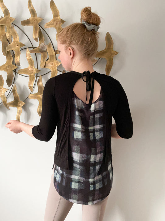 RW & Co. Black 3/4 Sleeve Plaid Tie Back Tunic Top Shirt - XS/S