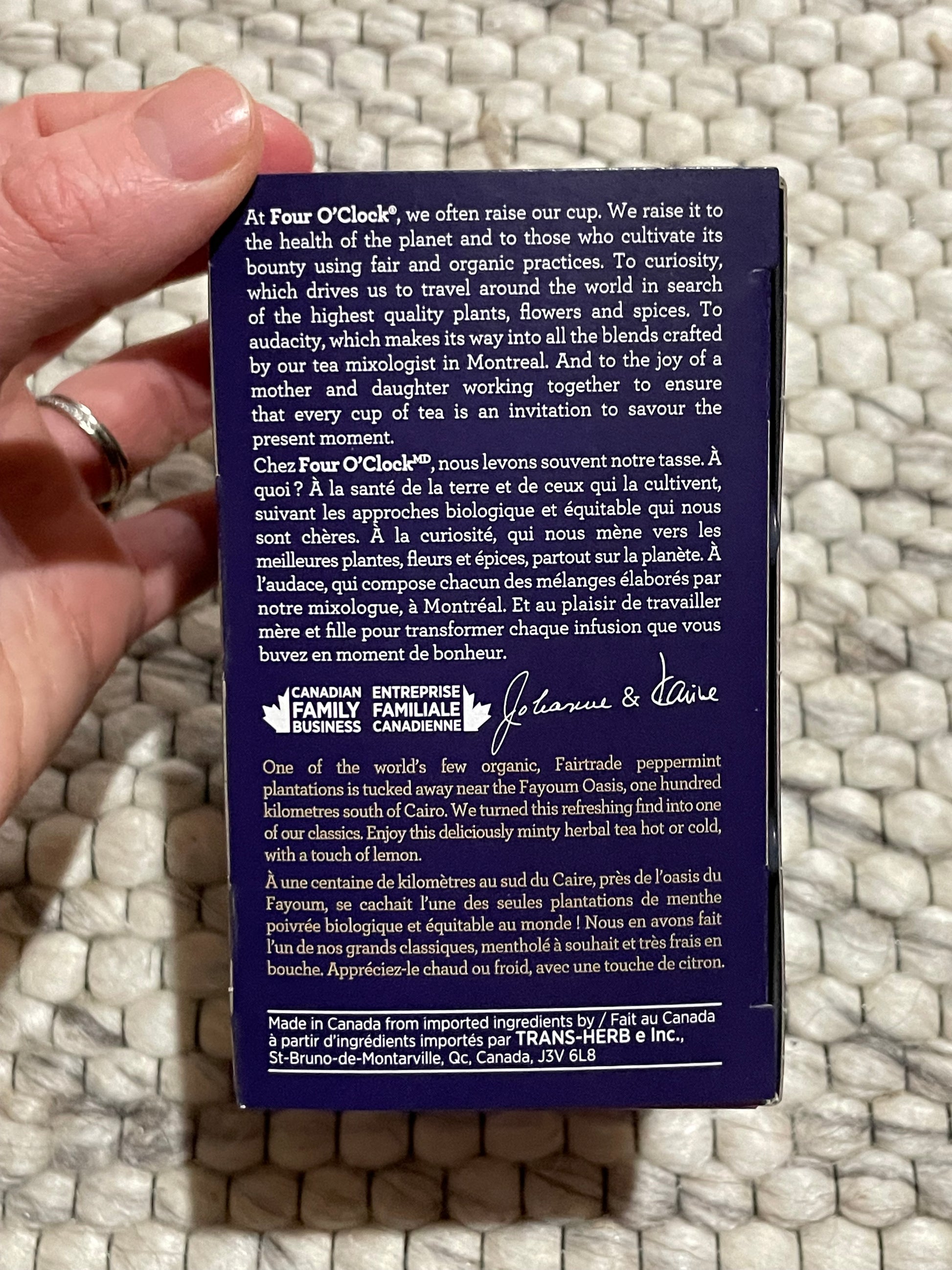 Ethically sourced and blended in Canada by Four O’Clock, this peppermint tea delivers clean, crisp flavour without additives or artificial ingredients.