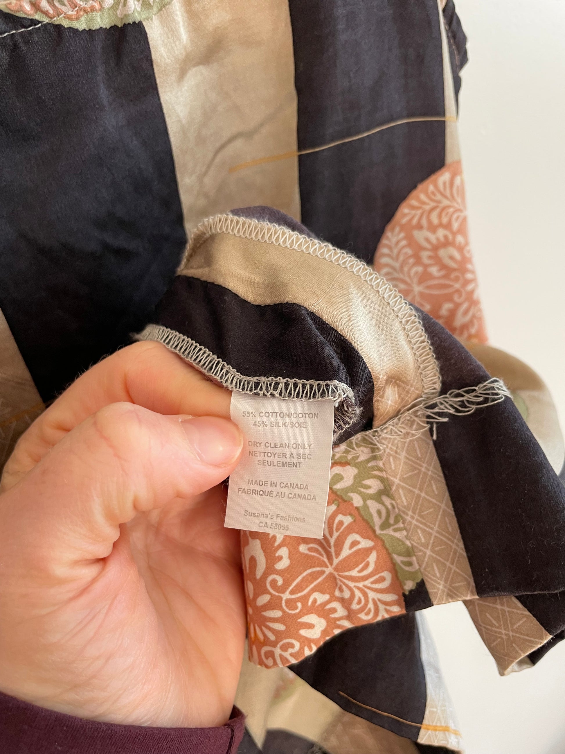 • Pattern: black and beige stripes with terracotta, cream, and sage green medallions