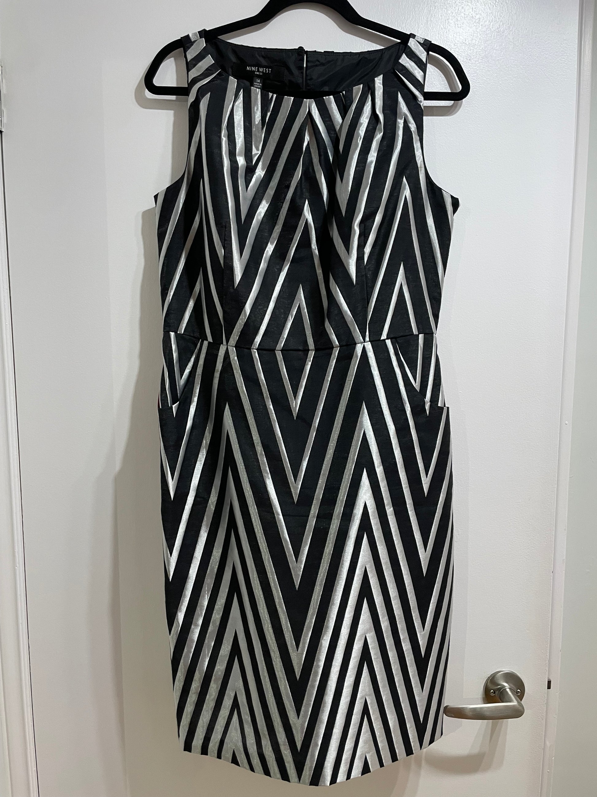 Nine West Black & Silver Chevron Sheath Dress with Red Belt – Size 14