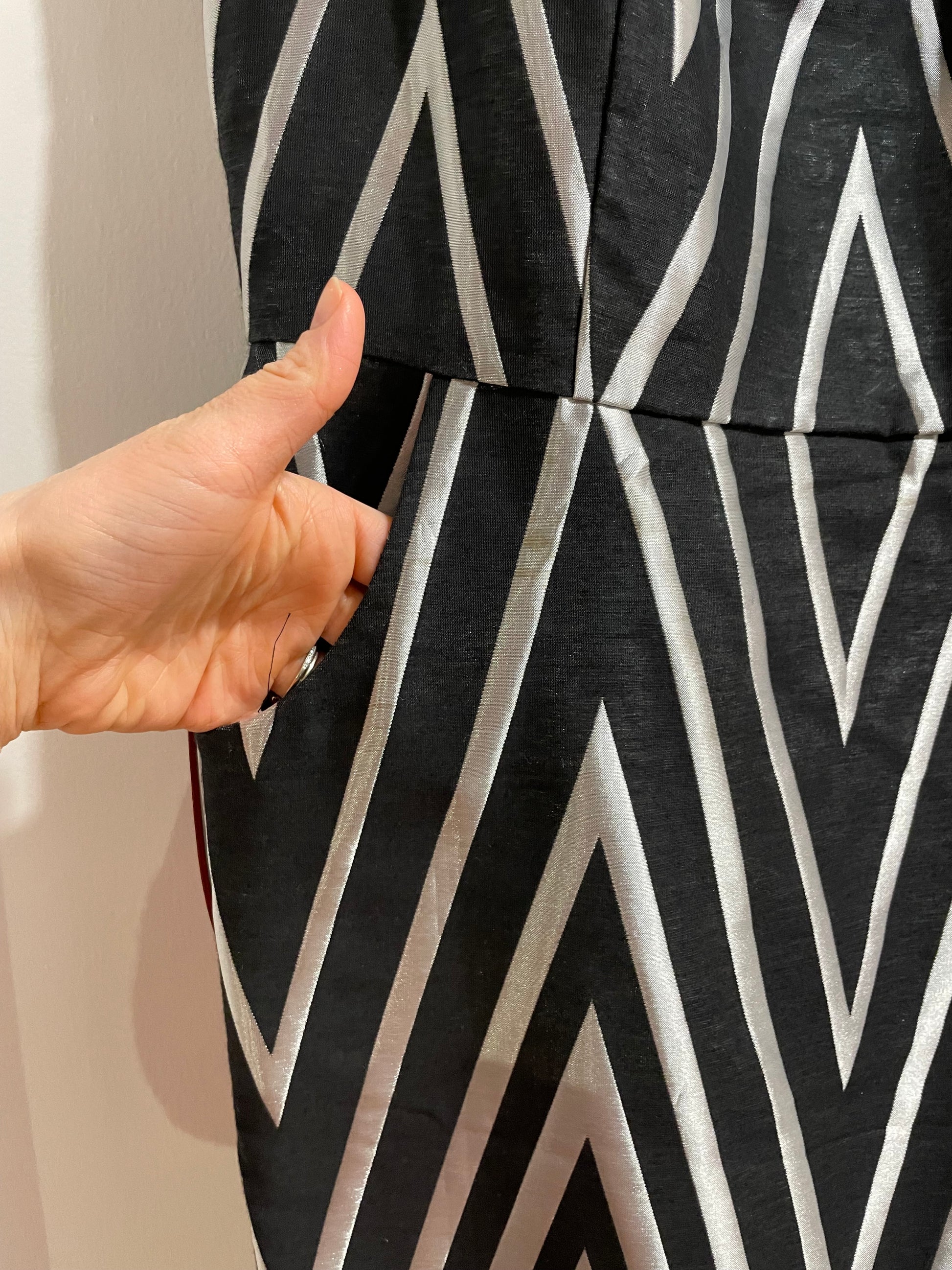 Bold yet timeless, this Nine West dress makes a striking statement. Designed with a metallic silver chevron pattern over black, it features a tailored sheath silhouette that flatters every curve. The detachable red belt adds a pop of colour and structure, giving it a polished, modern finish.
