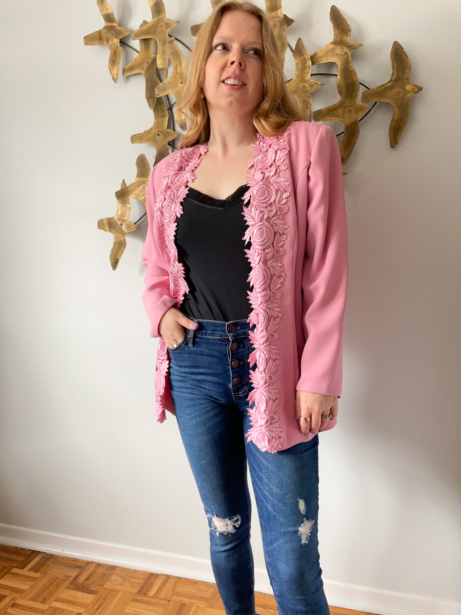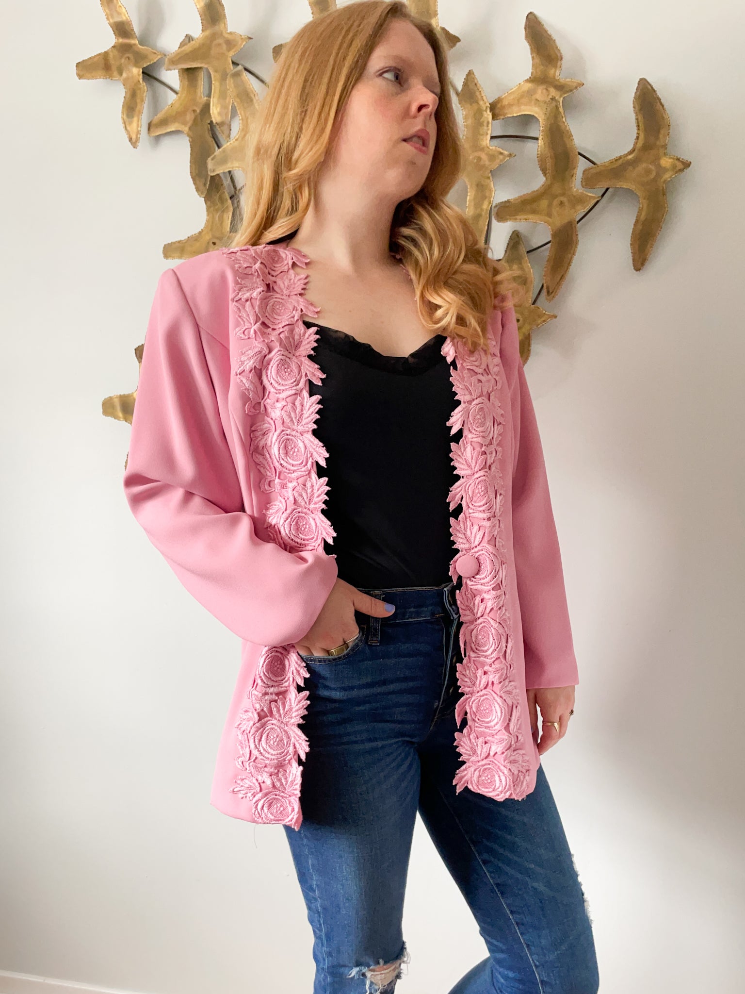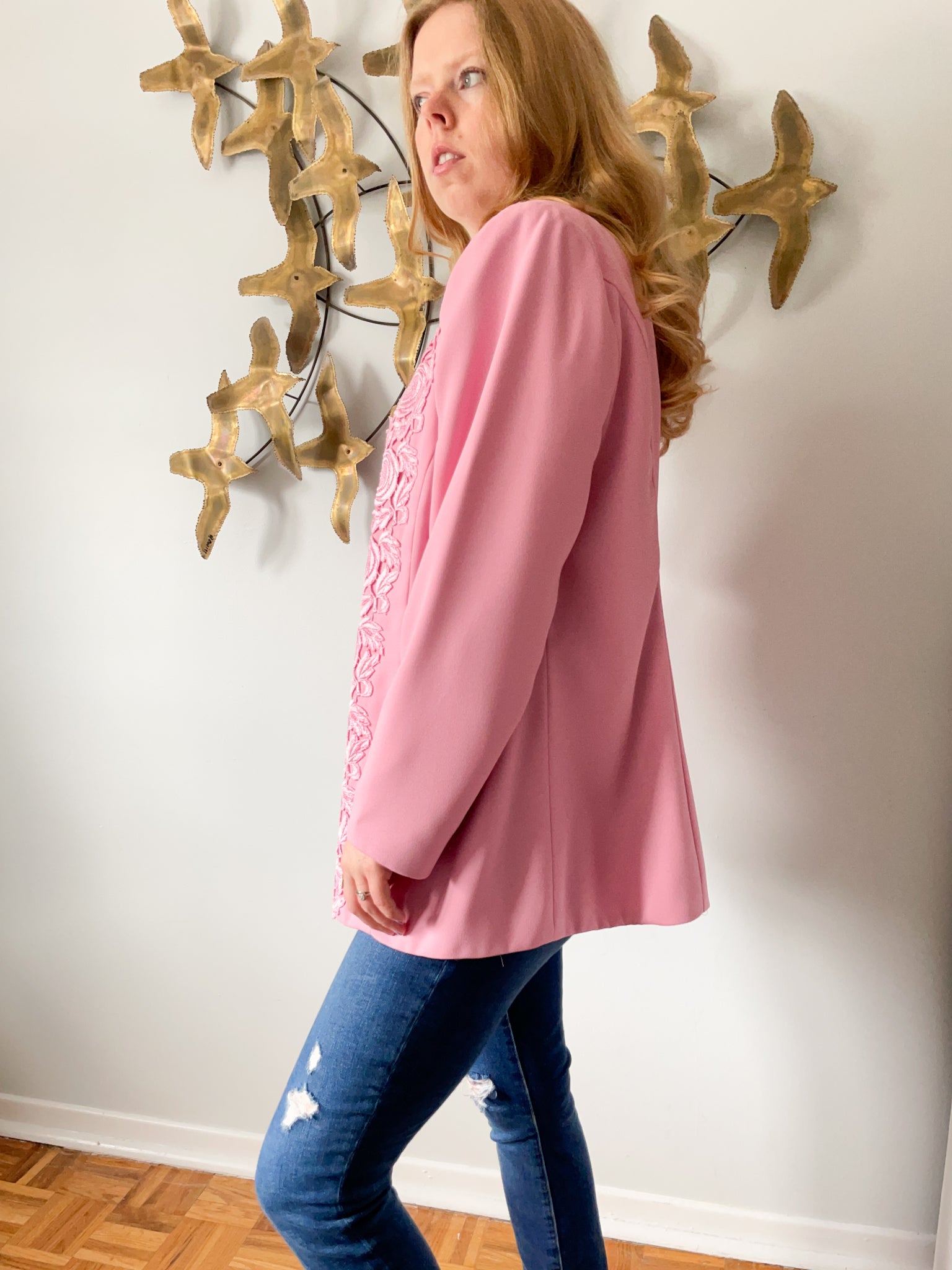 Vintage Pink Lace Trimmed Open Long Blazer - Large