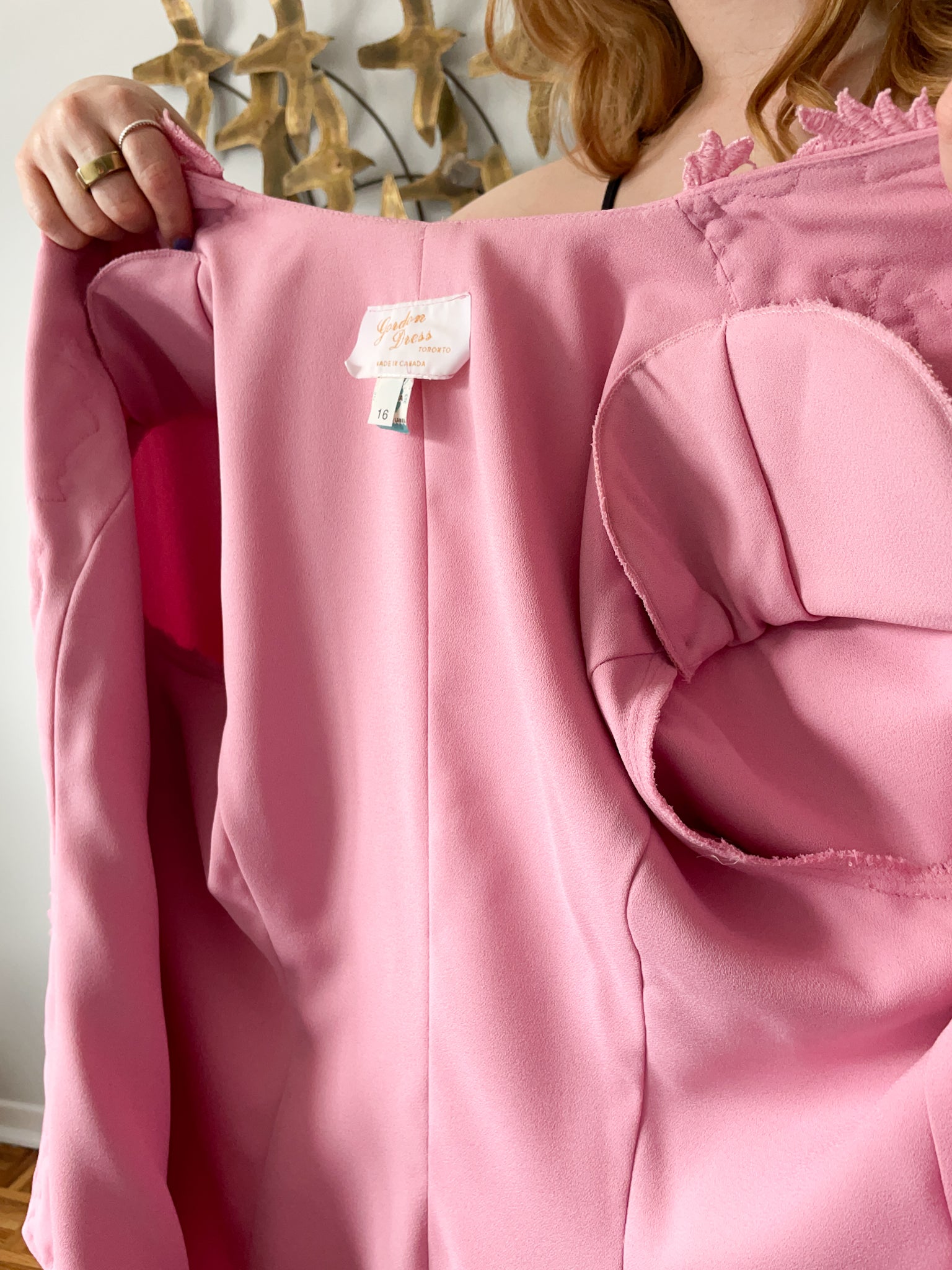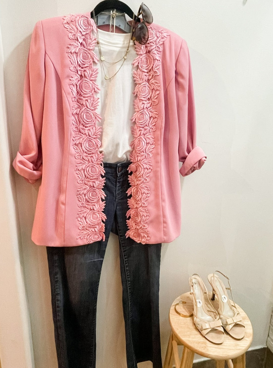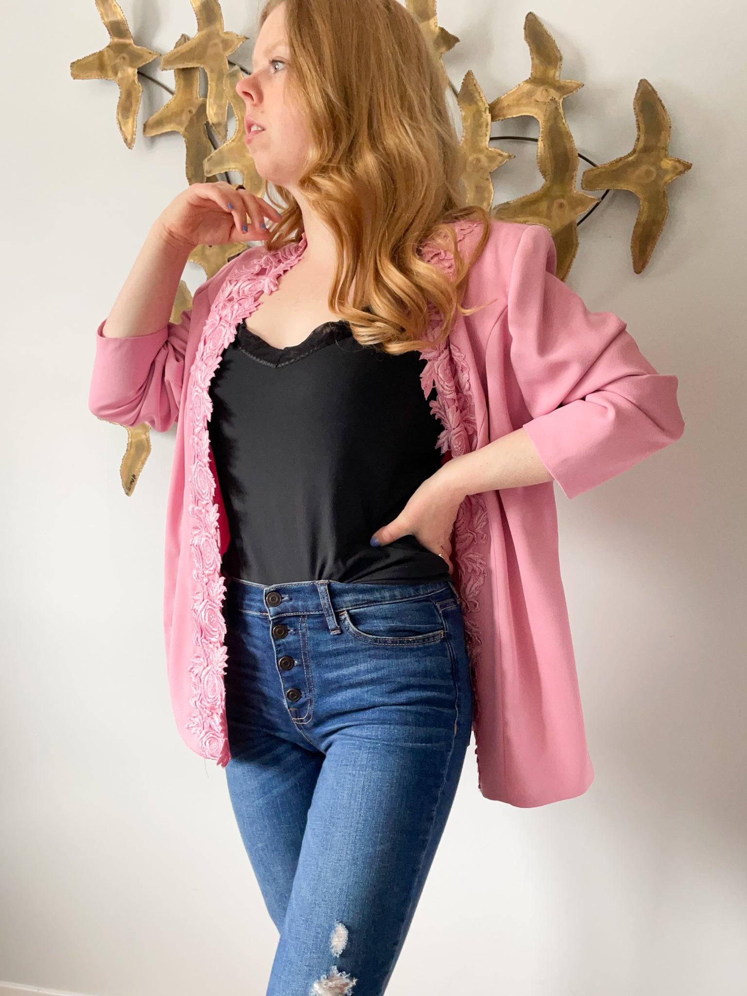 Vintage Pink Lace Trimmed Open Long Blazer - Large