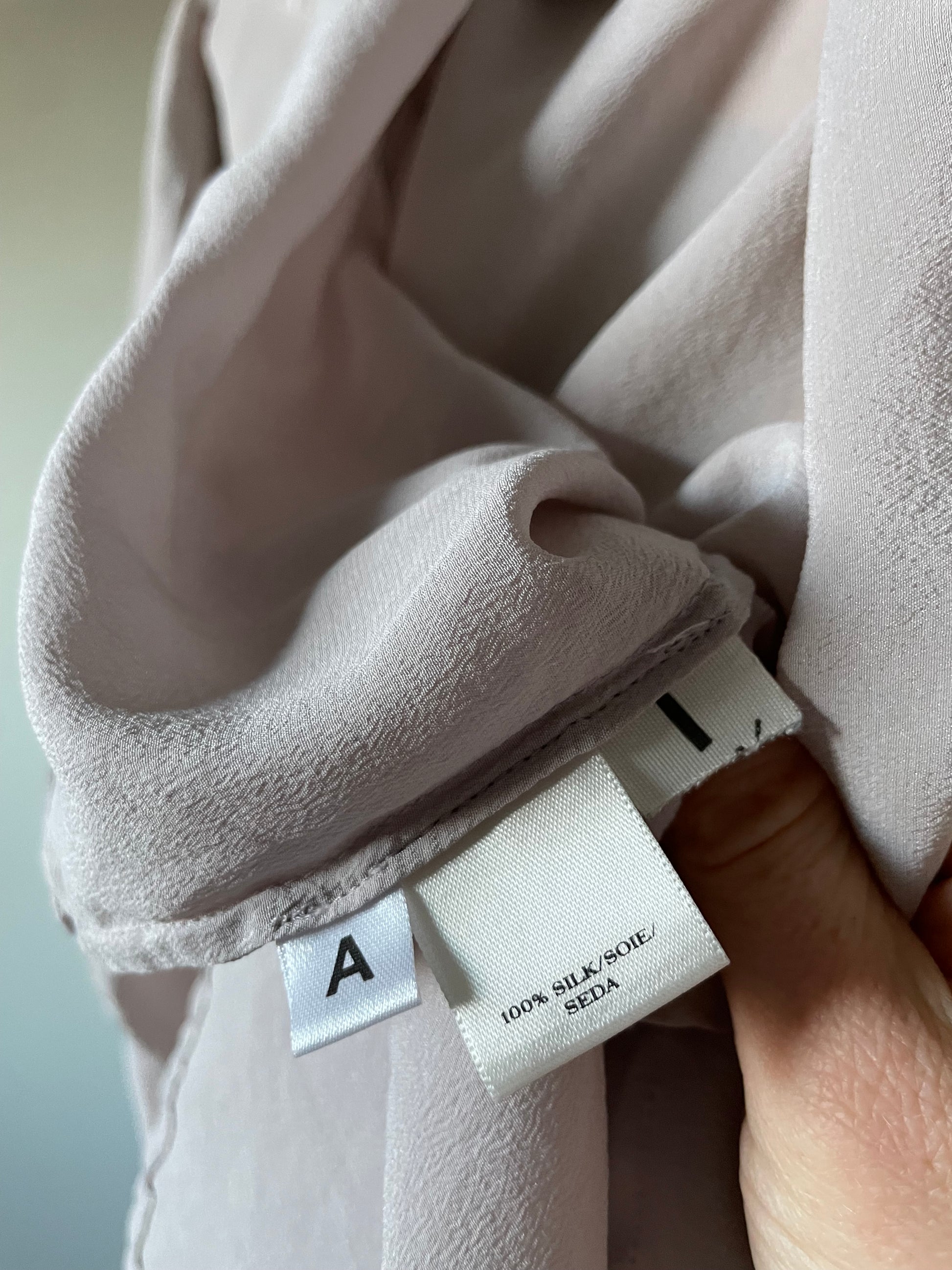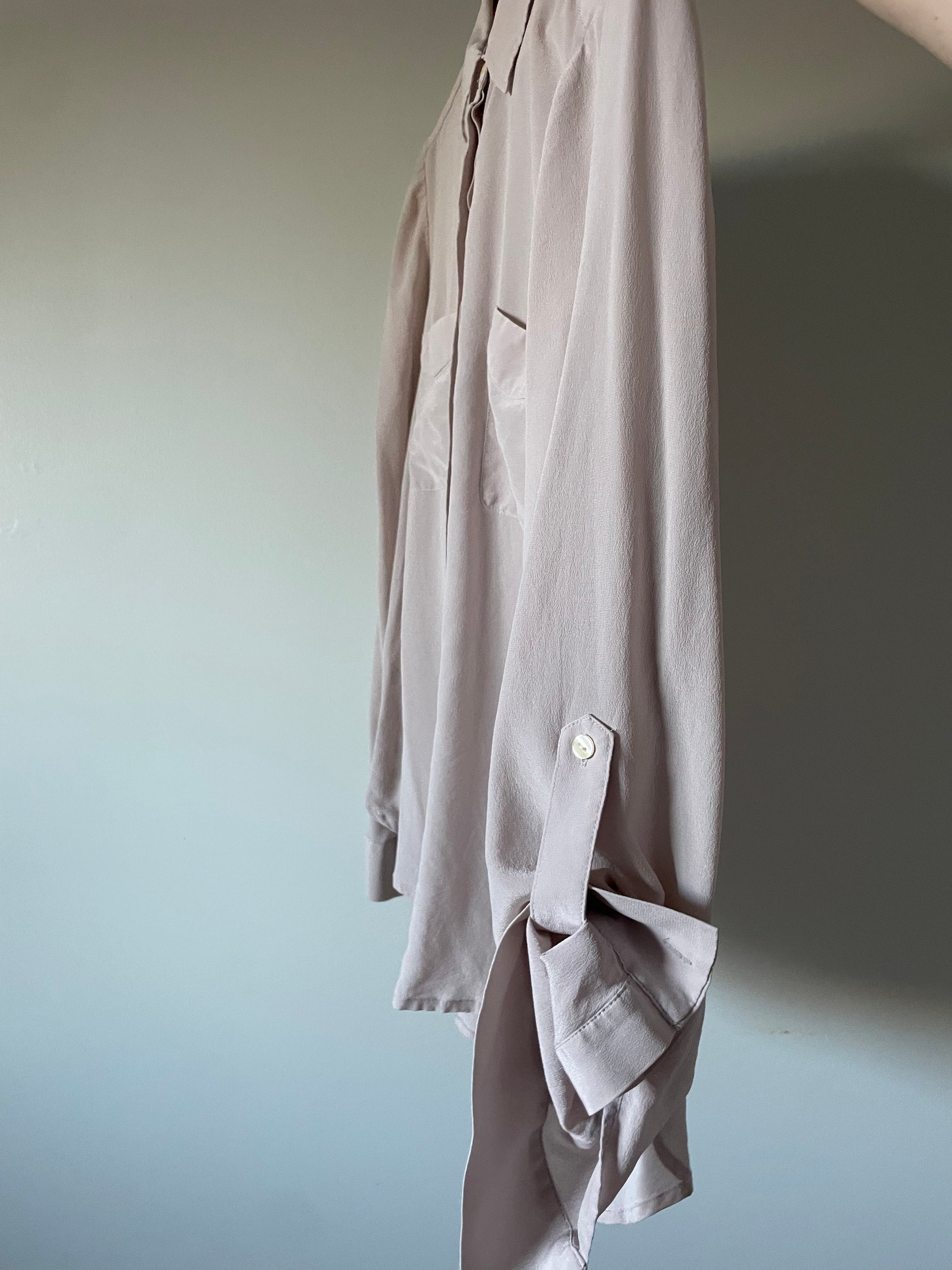 This Ann Taylor 100% silk button-up shirt shimmers softly in a pearly oyster hue with a hint of mauve — a stunning neutral that feels both timeless and modern. The fluid silk drape and subtle texture offer effortless sophistication, while details like front chest pockets, button cuffs, and roll-tab sleeves make it versatile for dressing up or down.