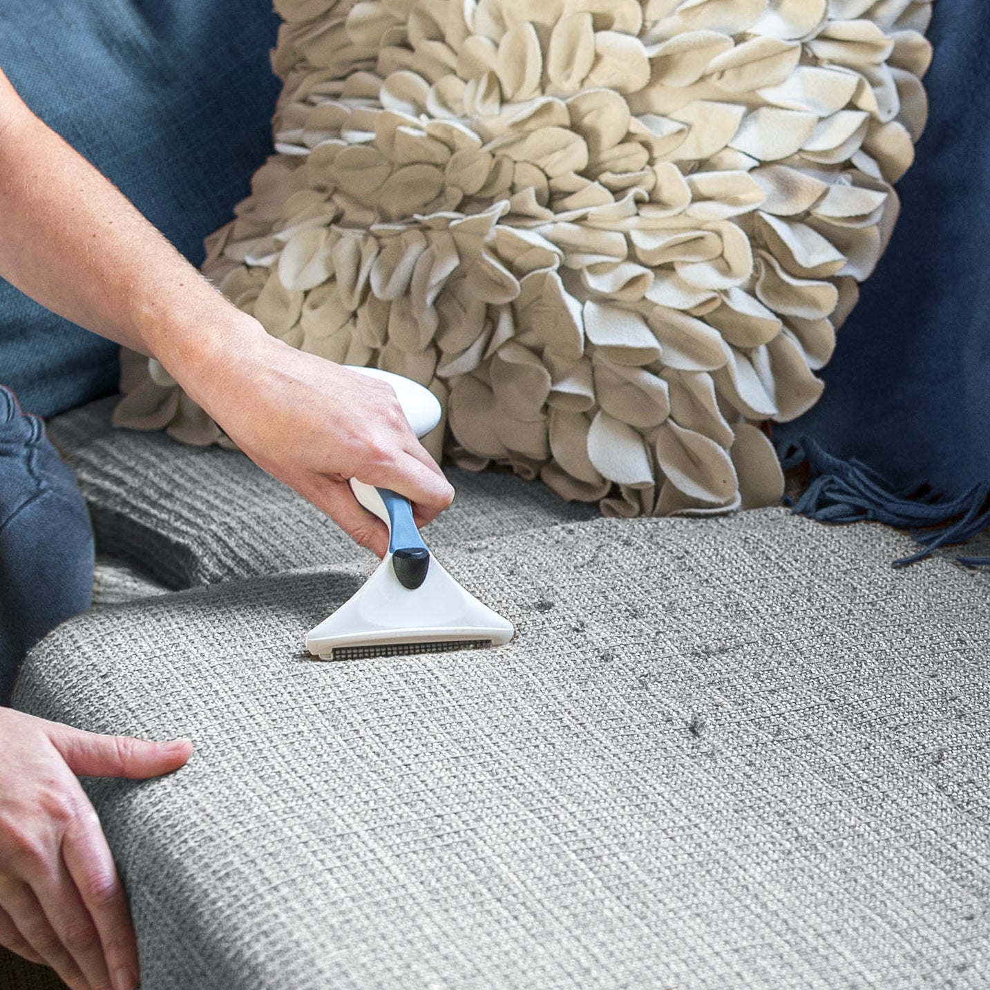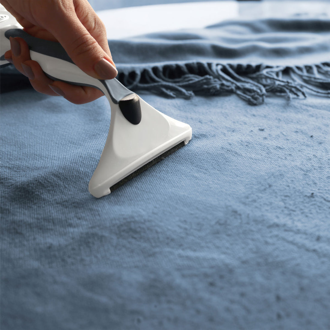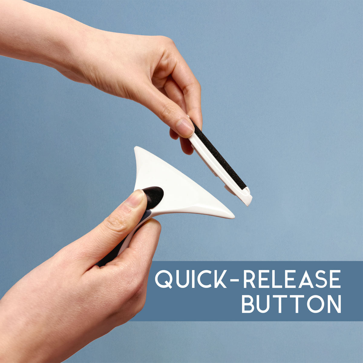 The patented handle features a soft-grip finish and ergonomic shape, with a quick-release button to easily switch edges—even during bigger jobs like blankets and cushions