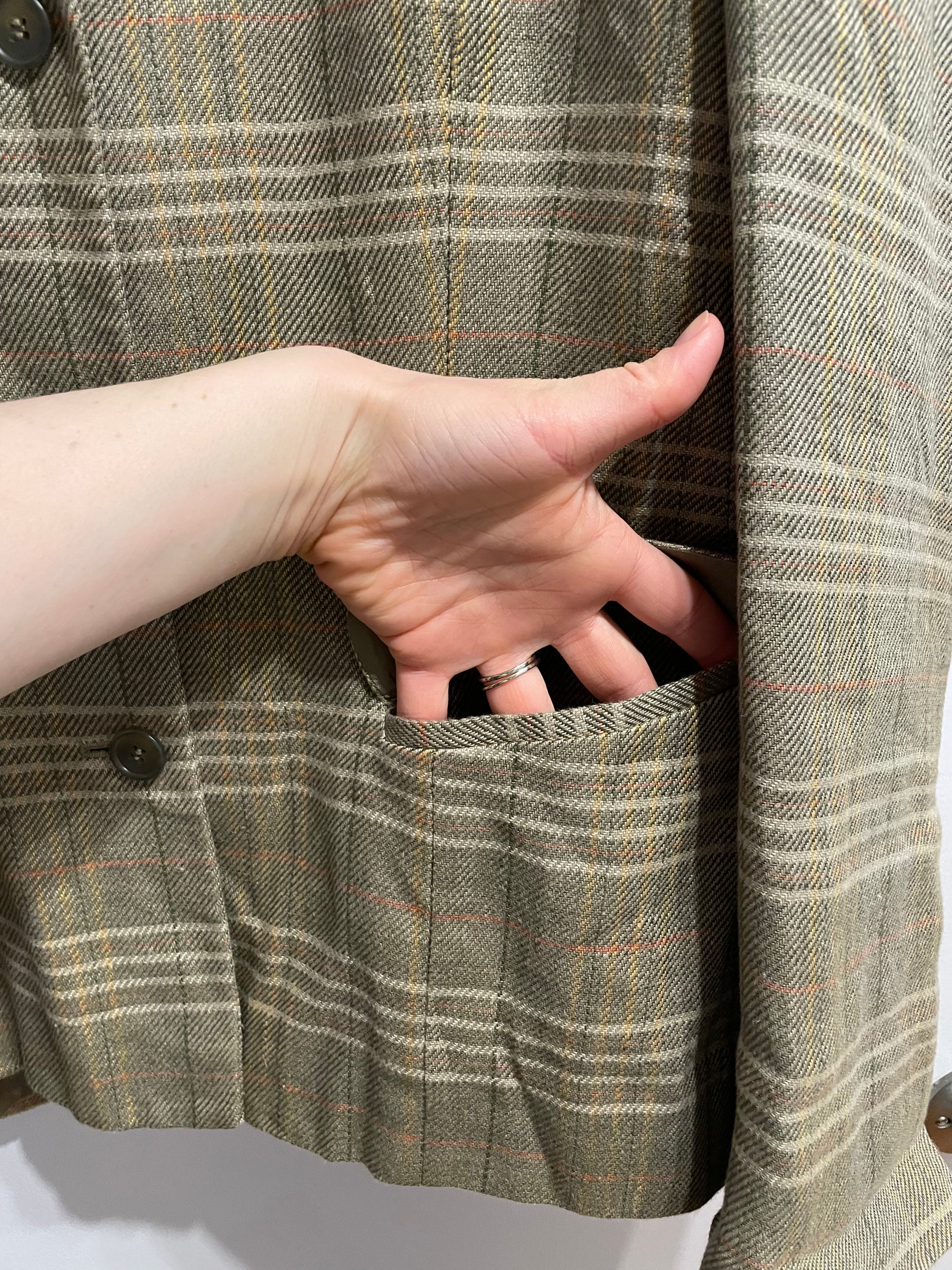 A beautifully tailored olive plaid blazer by Jones New York in breathable linen with subtle rust and cream windowpane detailing. This piece has that heritage, countryside-in-the-city feel — polished yet relaxed.