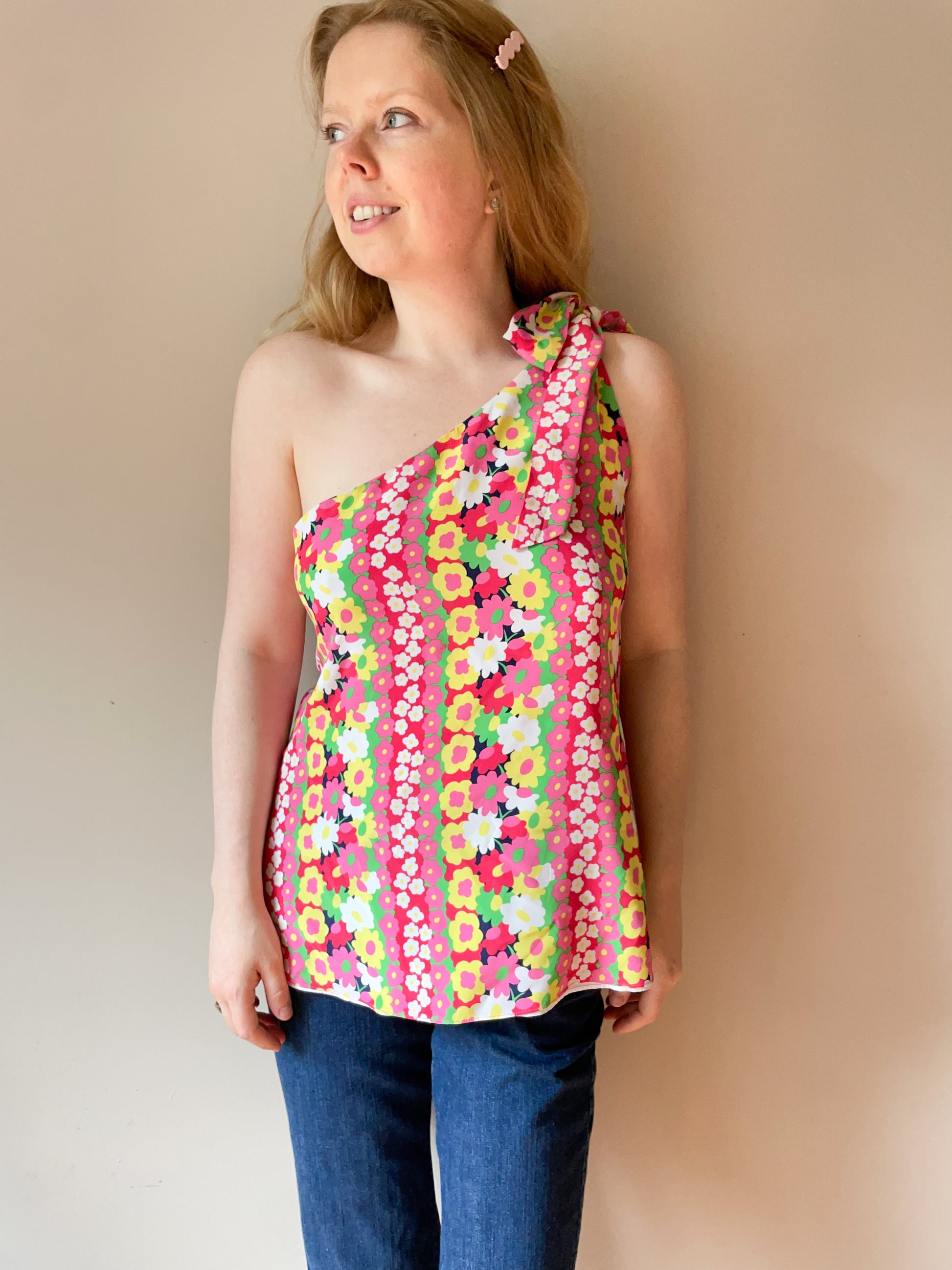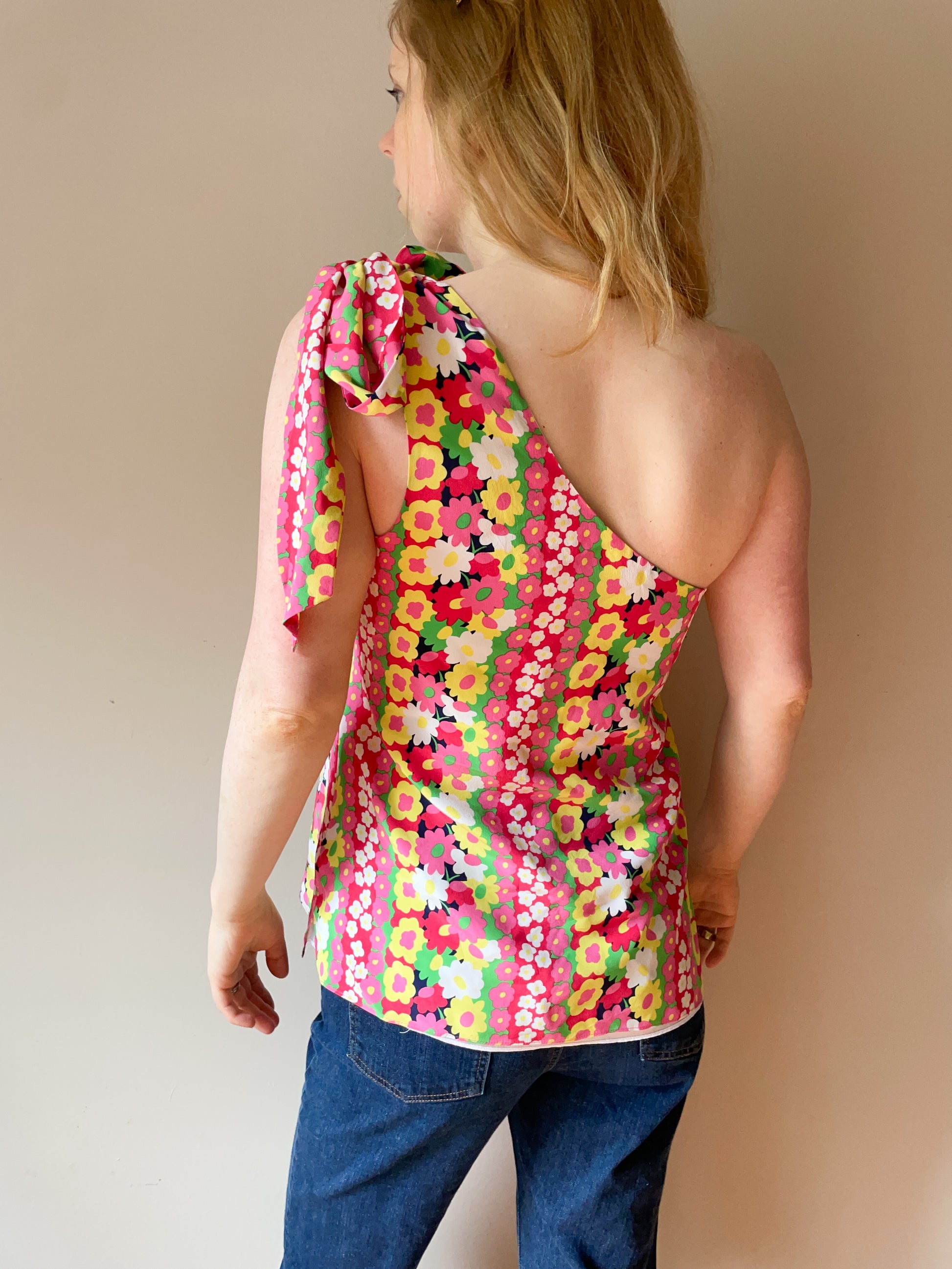- Straight fit, sleeveless top with one shoulder and bow tie strap.