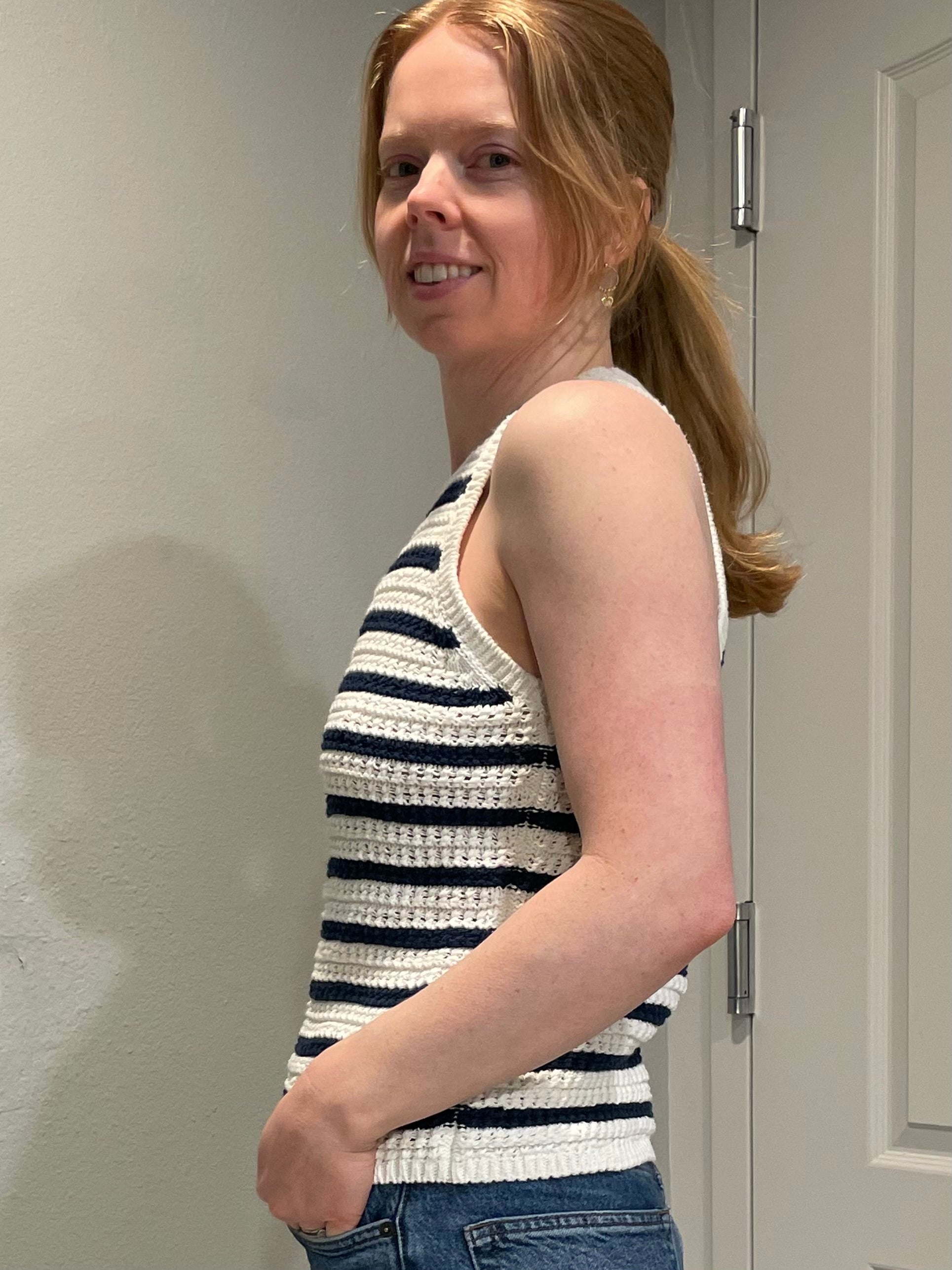 A timeless warm-weather staple from Madewell, this striped knit tank is one of those effortless pieces you’ll reach for again and again. Made from breathable cotton with a textured knit, it has a flattering high neckline and a clean, tailored fit that works beautifully on its own or layered under a blazer or jacket.