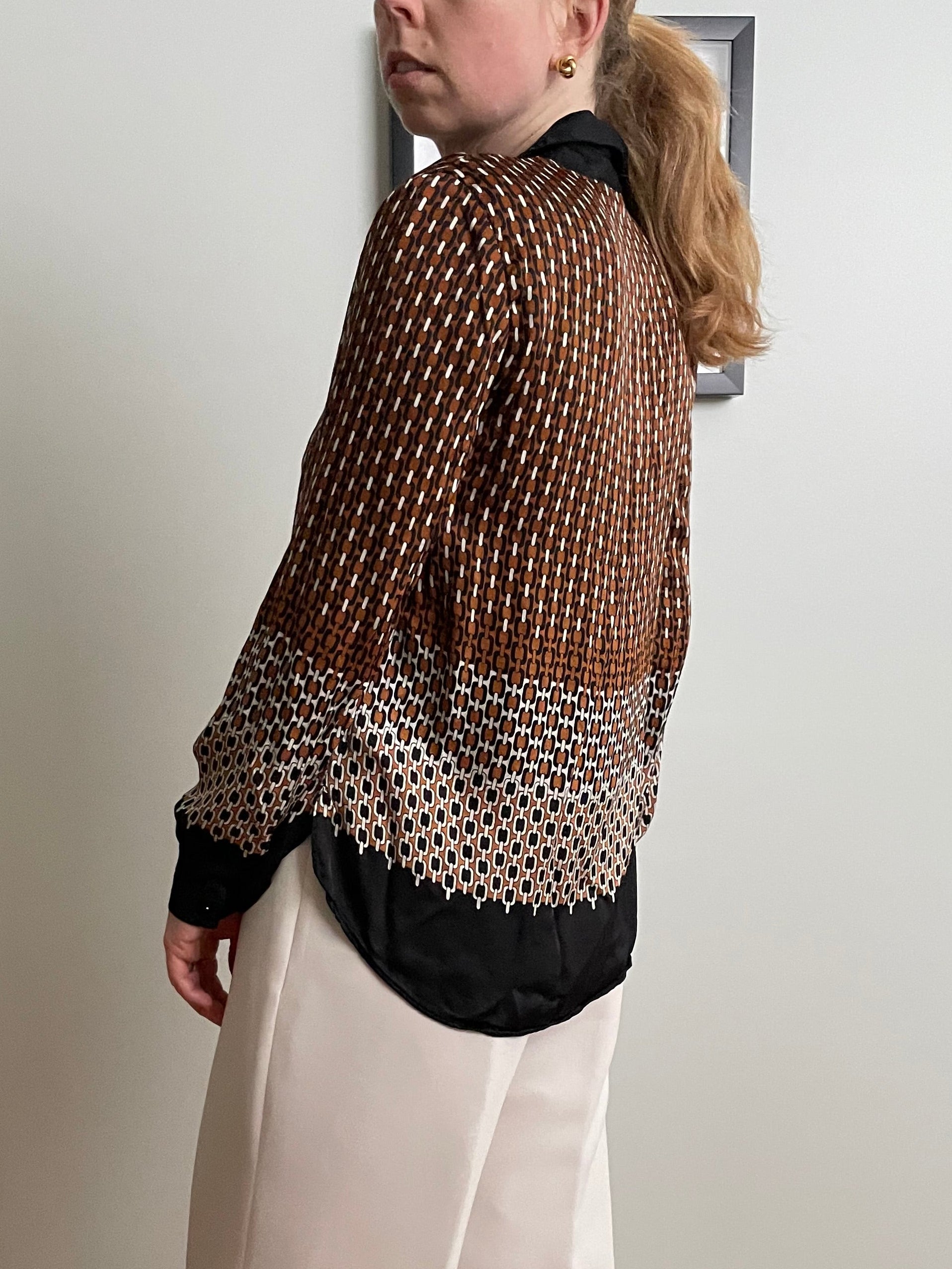 This Massimo Dutti blouse is one of those rare pieces that does the styling for you. The rich brown chain print paired with the black contrast collar and cuffs creates a polished, European-inspired look that feels both timeless and current.