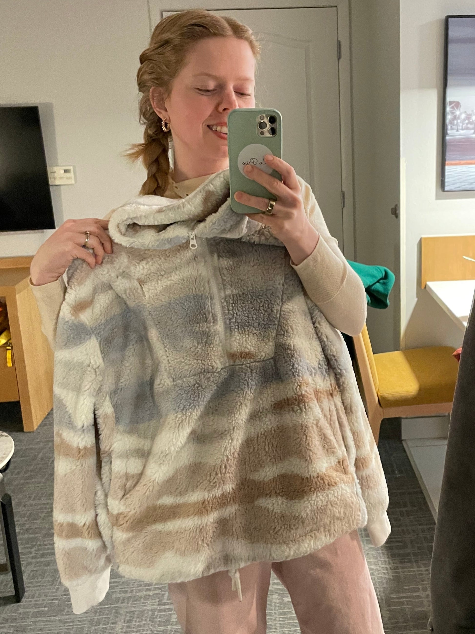 This ultra-cozy faux fur pullover from Mountain and Isles is the definition of elevated comfort. Designed with a soft neutral camo-inspired pattern in cream, taupe, and grey tones, it features a relaxed silhouette, half-zip neckline, and adjustable hem for versatile styling. Perfect for layering over leggings, denim, or lounge sets for effortless cozy days.