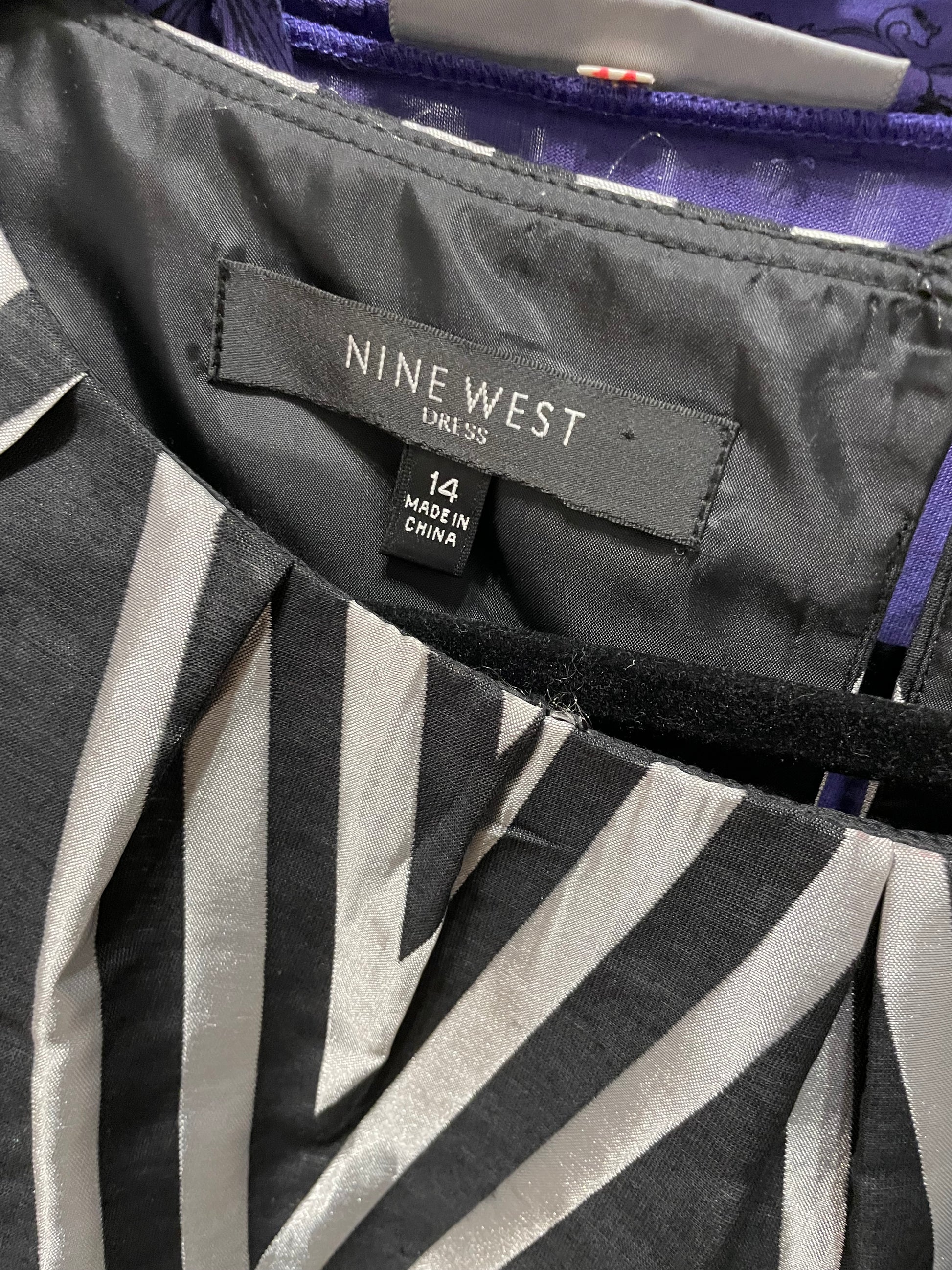 Nine West Black & Silver Chevron Sheath Dress with Red Belt – Size 14