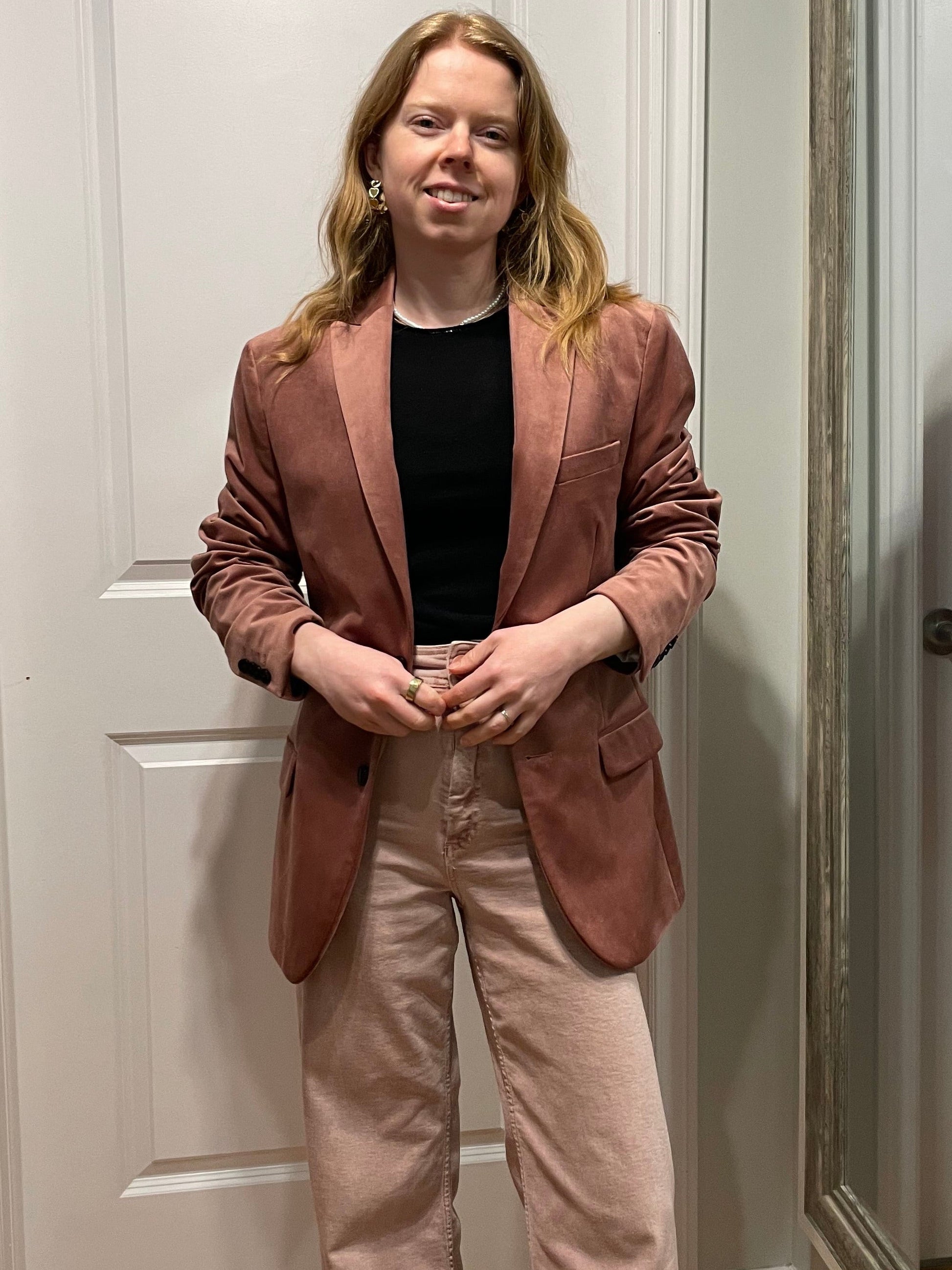 A softly structured velvet blazer in a muted dusty rose tone, designed in RW&CO’s signature slim fit. This piece brings a polished, modern feel while still feeling relaxed and wearable — perfect layered over a tee, tank, or knit for everyday elevation. Fully lined with clean tailoring details and a flattering longer length that works just as well with denim as it does with tailored trousers.