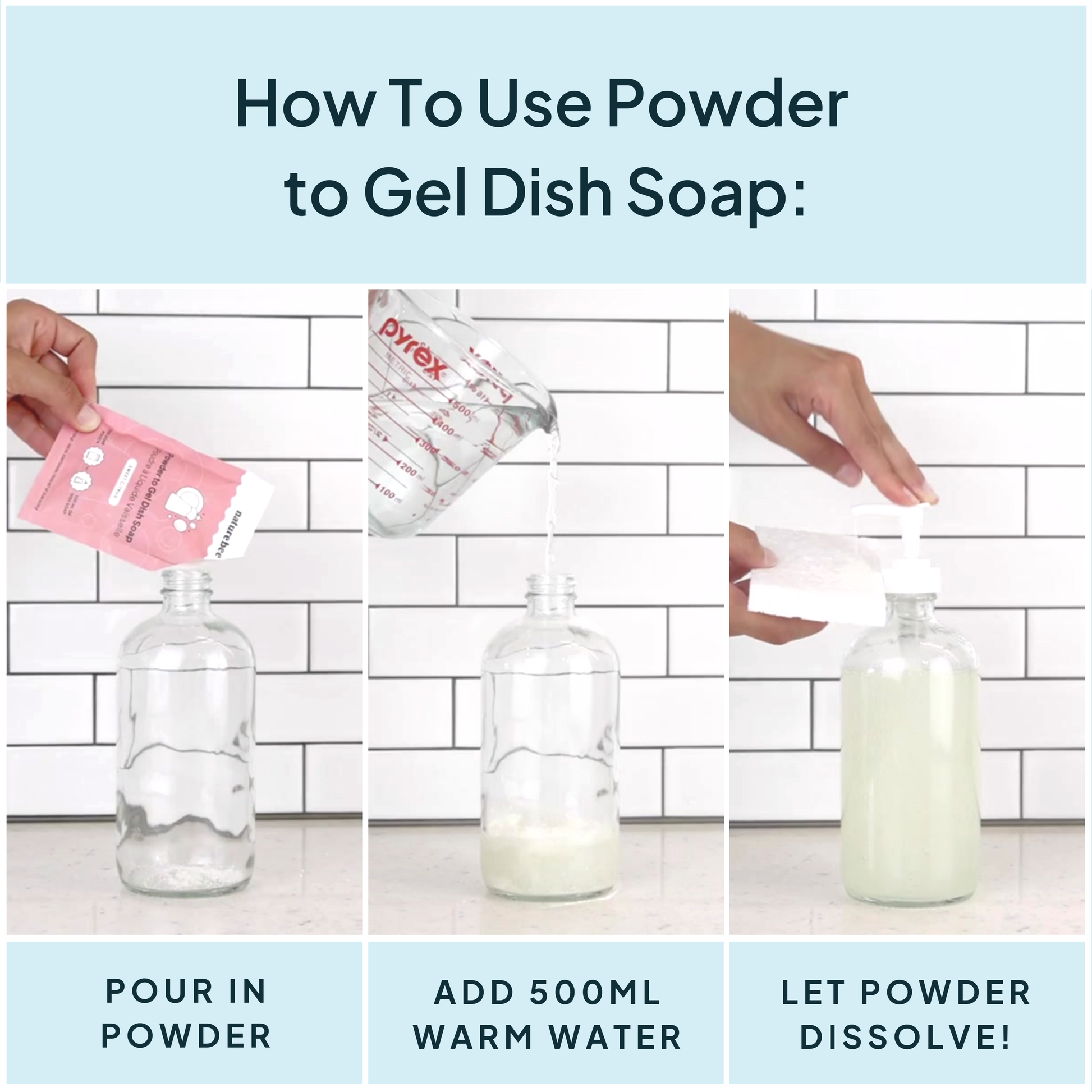HERE’S HOW IT WORKS: - Pour the powder contents (24g) into a dish soap container of choice. - Pour in 500-700ml of warm filtered water. 500 ml will be a thicker gel. Adjust water ratio based on your preferences. - Gently Shake or stir for 30 seconds - Leave to thicken and activate for 15-30 minutes. - Happy Cleaning!