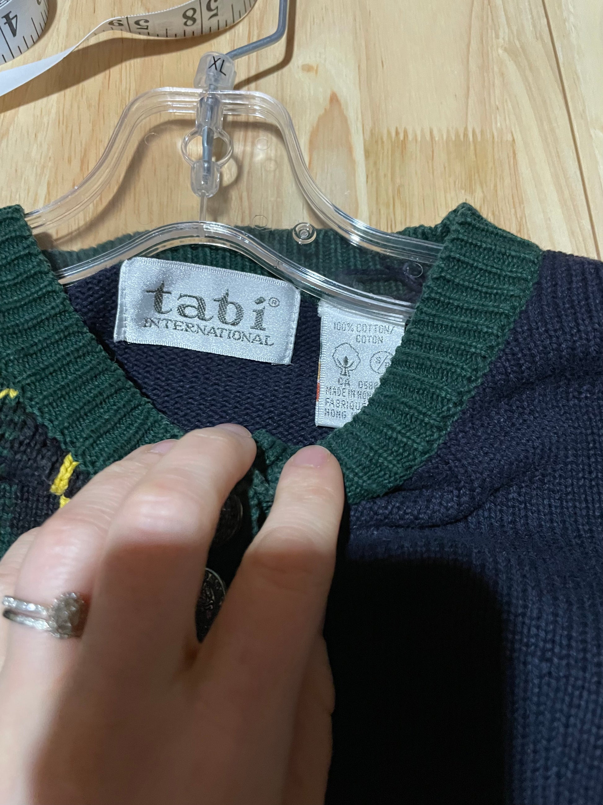 Add a touch of vintage sophistication with this navy cotton knit cardigan by Tabi International. Featuring a rich plaid motif in red, green, and gold with an ornate crest embroidery, this piece channels timeless preppy elegance. The forest green ribbed trim and gold-tone buttons complete the look with a luxurious finish.