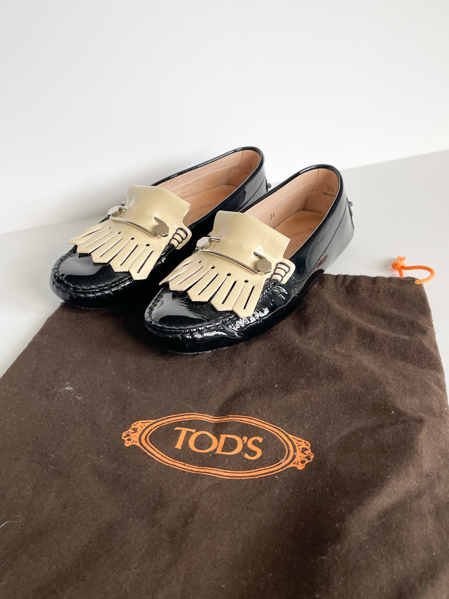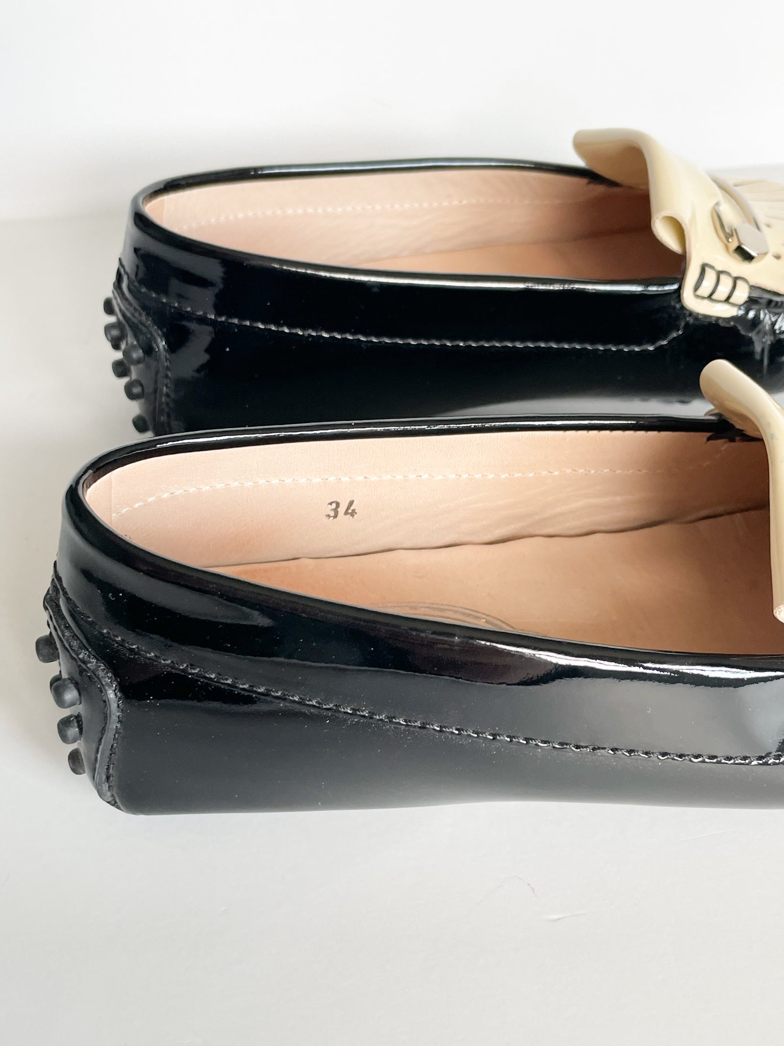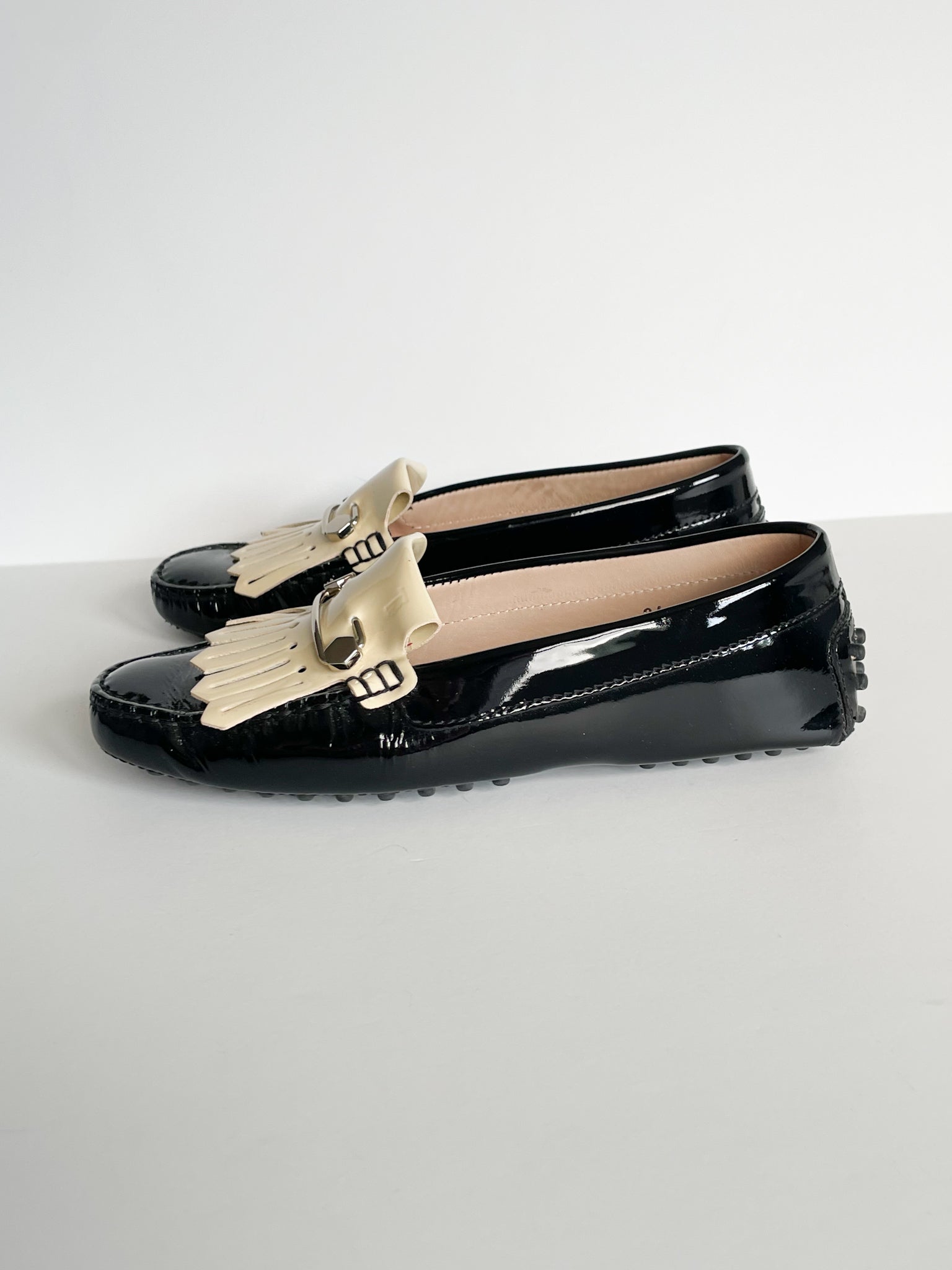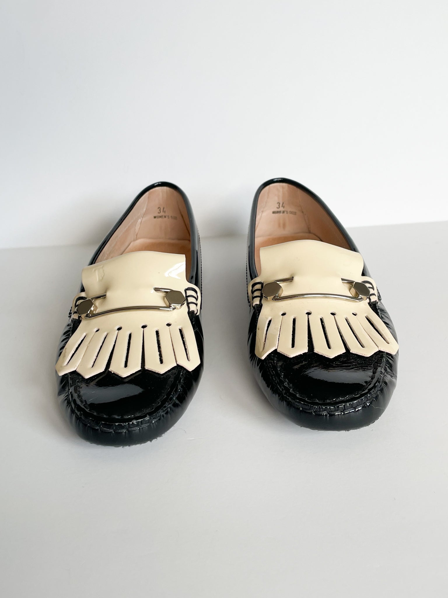 TOD'S Black Cream Fringed Patent Leather Loafers - Size 34