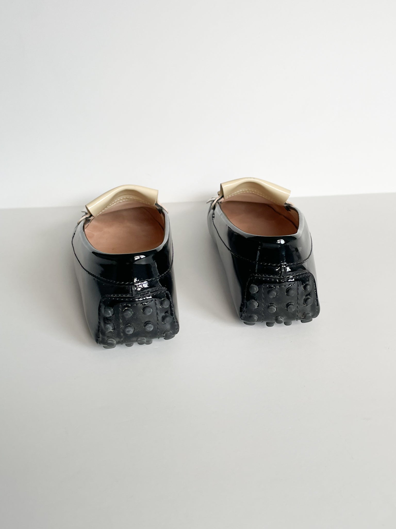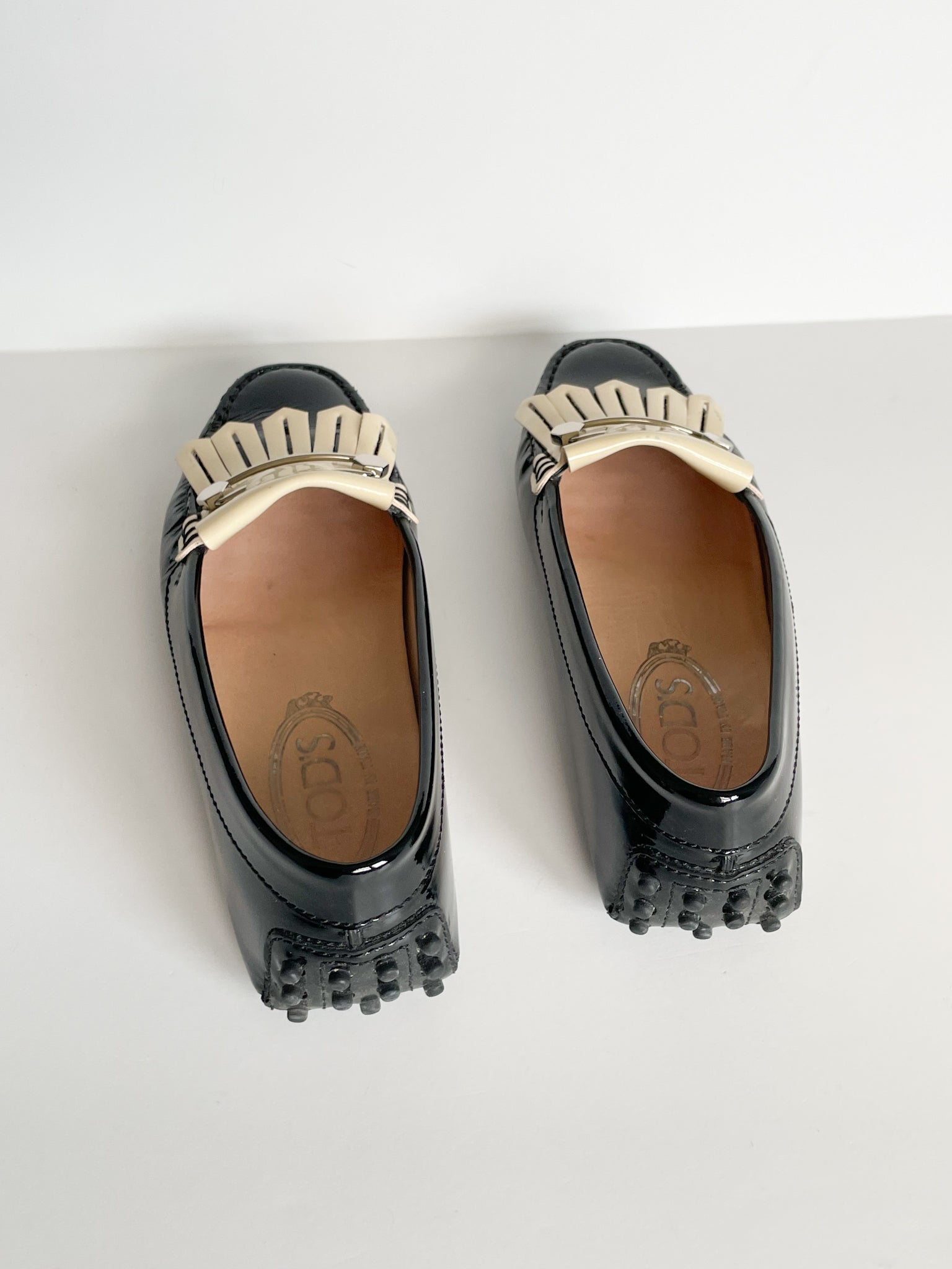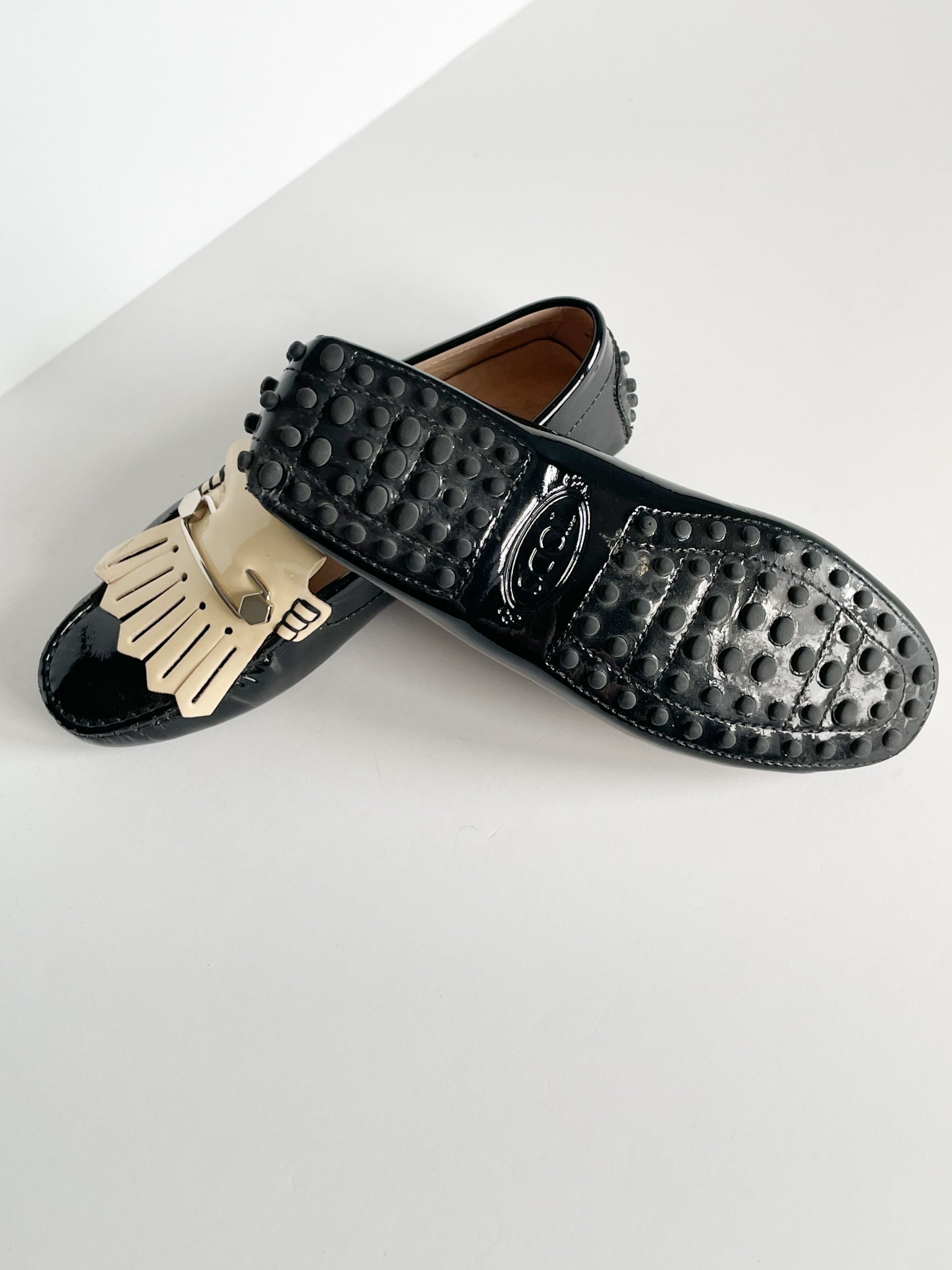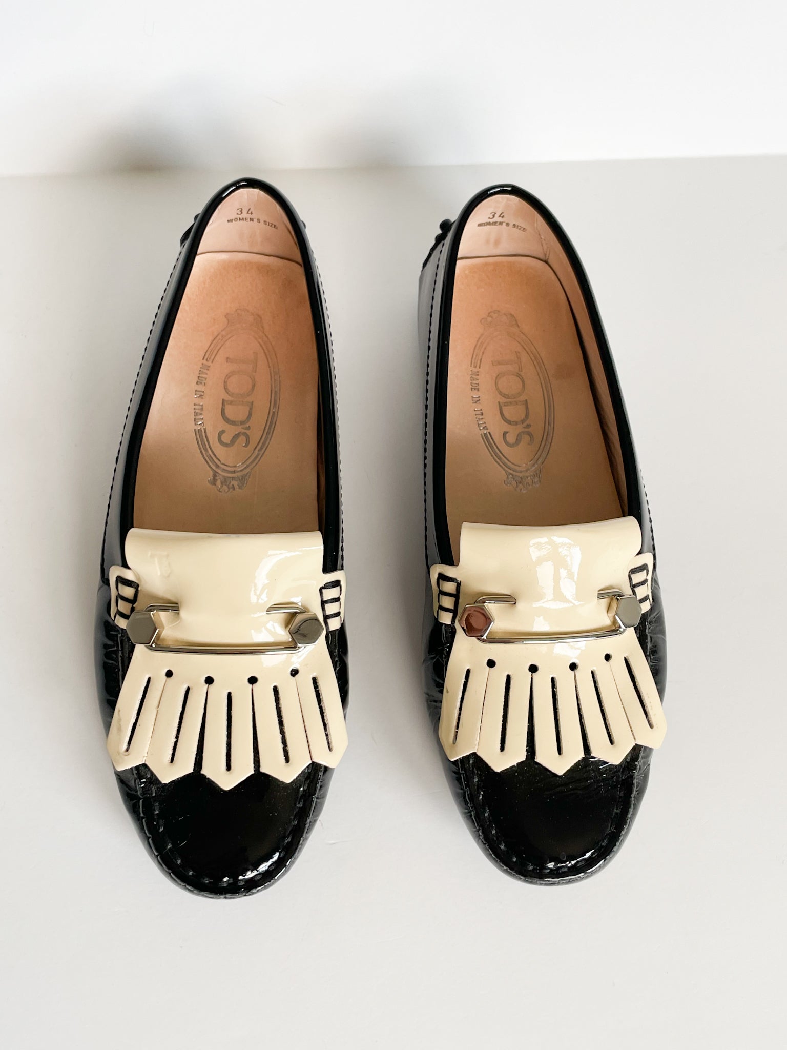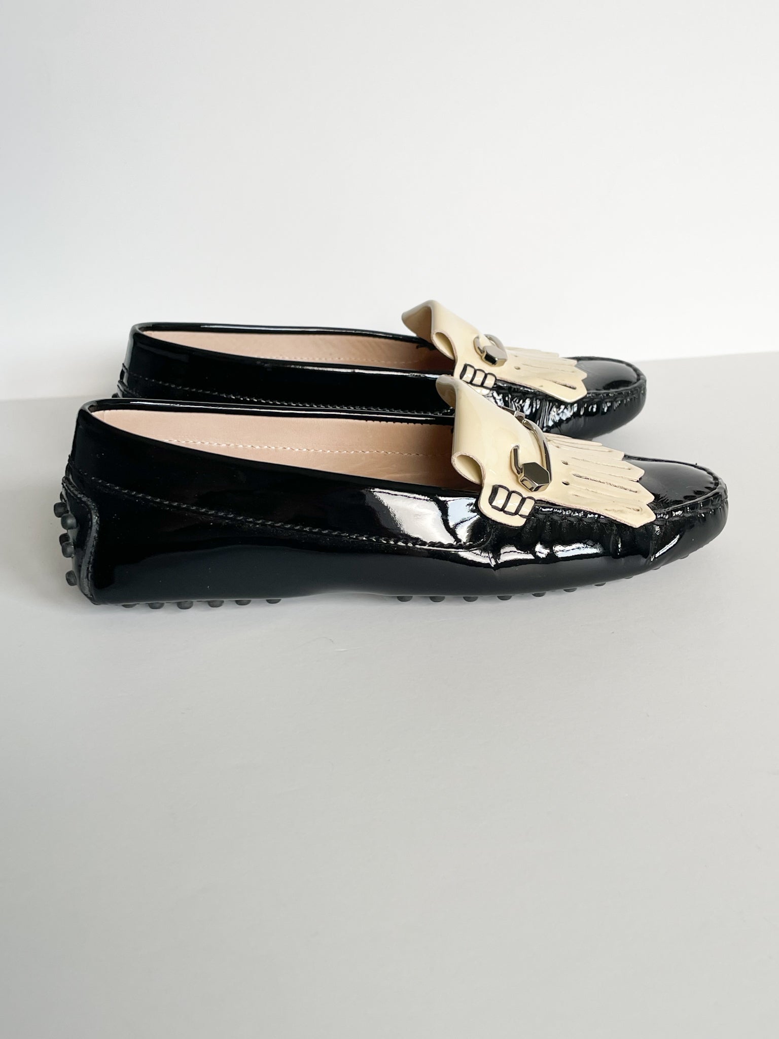 TOD'S Black Cream Fringed Patent Leather Loafers - Size 34