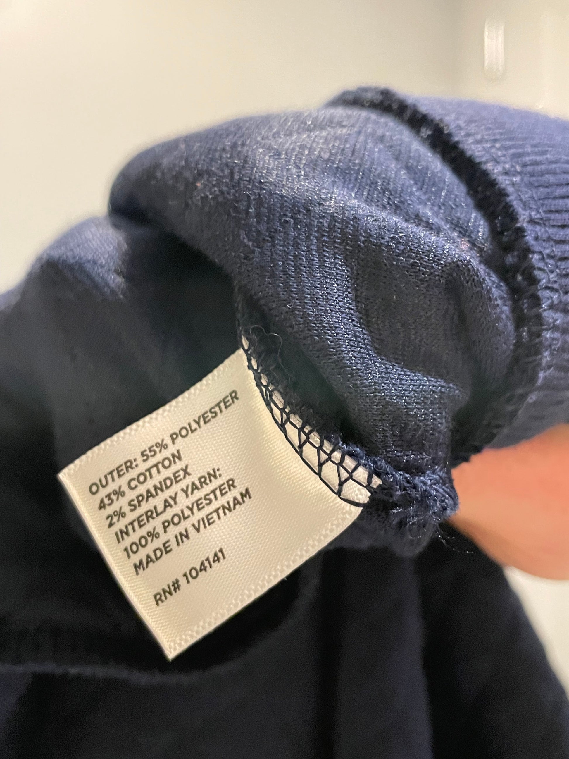 - Outer: 55% polyester, 43% cotton, 2% spandex