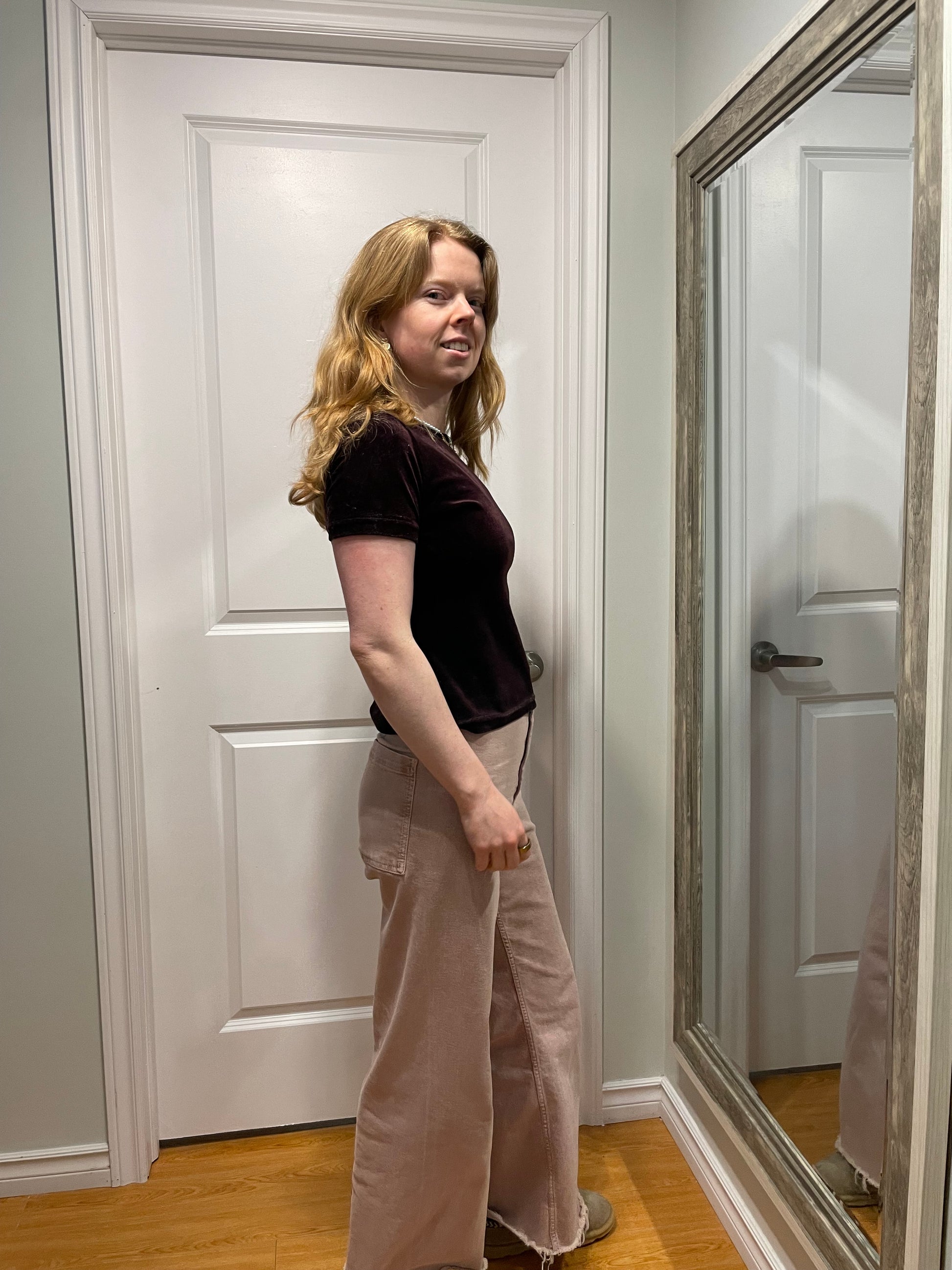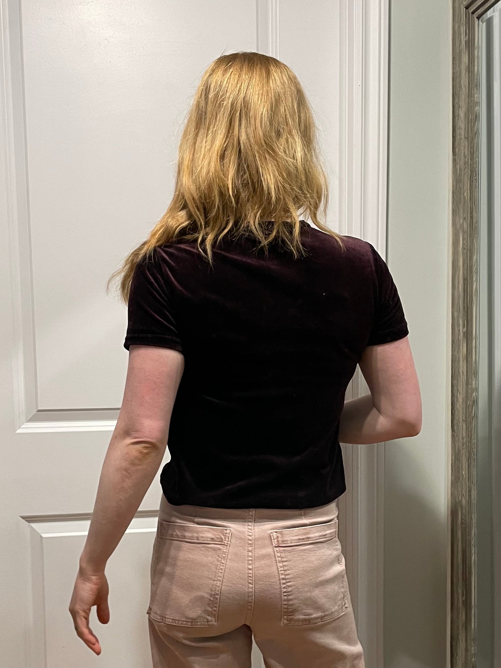 The velvet fabric is smooth, comfortable, and flexible, making it easy to dress up or down. A standout vintage basic that layers beautifully under blazers, cardigans, or worn solo with denim.